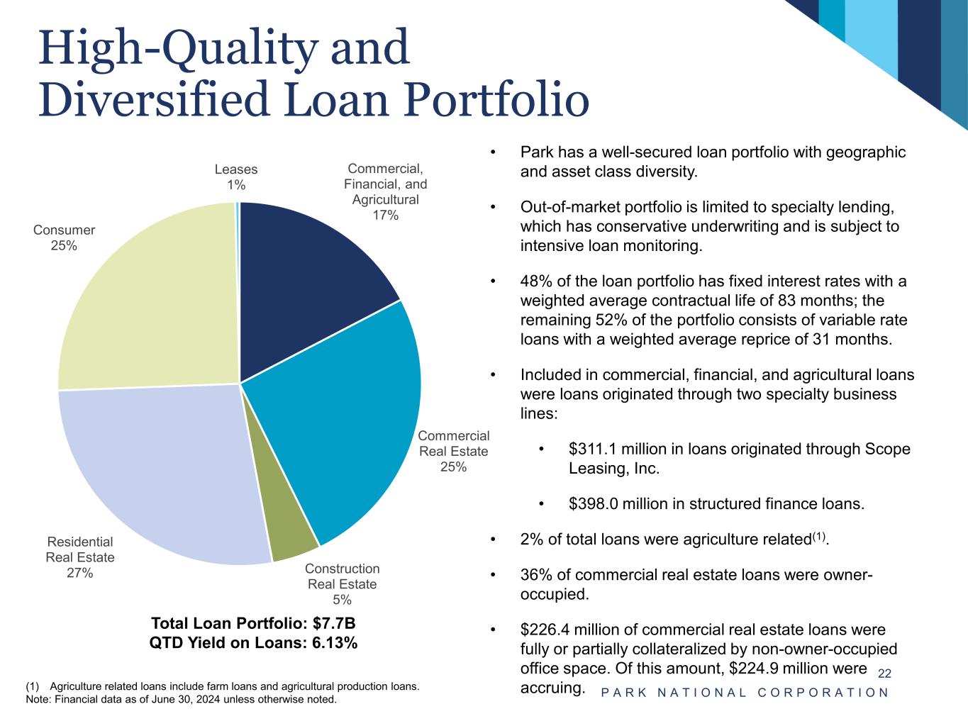 Robust Capital Ratios P A R K N A T I O N A L C O R P O R A T I O N 21(1) Adequately capitalized thresholds plus capital conservation buffer of 2.5%. Note: All ratios presented are as of the end of the period. Note: Financial data as of June 30, 2024 unless otherwise noted. Tier 1 Leverage Ratio Common Equity Tier 1 Ratio Tier 1 Risk-based Capital Ratio Total Risk-based Capital Ratio Regulatory Minimums(1) (1) (1) (1) (1) 9.8% 9.9% 10.6% 10.7% 11.3% 4.0% – 2.0% 4.0% 6.0% 8.0% 10.0% 12.0% 2021Q4 2022Q4 2023 Q3 2023 Q4 2024 Q2 12.4% 12.6% 12.7% 12.8% 13.0% 7.0% – 2.0% 4.0% 6.0% 8.0% 10.0% 12.0% 14.0% 16.0% 2021Q4 2022Q4 2023 Q3 2023 Q4 2024 Q2 12.6% 12.8% 12.9% 13.0% 13.2% 8.5% – 2.0% 4.0% 6.0% 8.0% 10.0% 12.0% 14.0% 16.0% 2021Q4 2022Q4 2023 Q3 2023 Q4 2024 Q2 16.1% 16.1% 16.2% 16.2% 16.4% 10.5% 9.0% 10.0% 11.0% 12.0% 13.0% 14.0% 15.0% 16.0% 17.0% 2021Q4 2022Q4 2023 Q3 2023 Q4 2024 Q2
