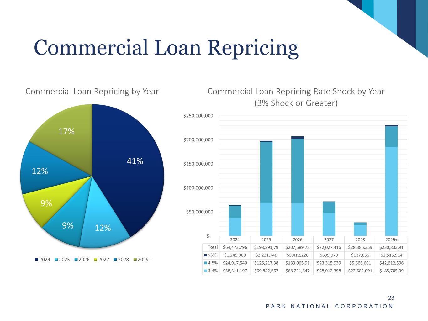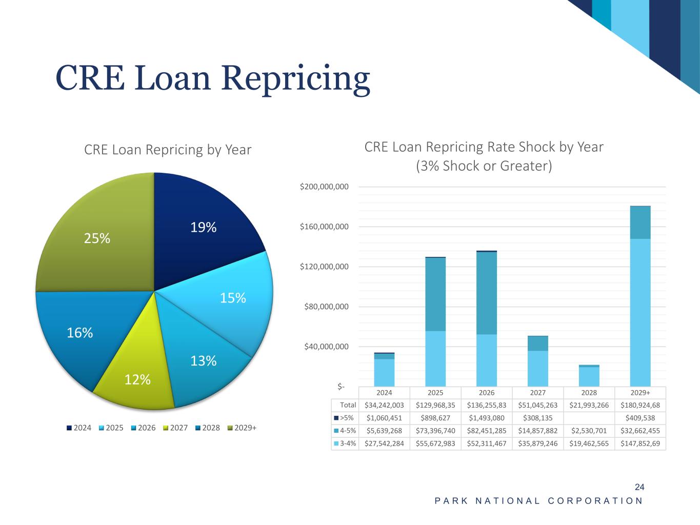 2024 2025 2026 2027 2028 2029+ Total $64,473,796 $198,291,79 $207,589,78 $72,027,416 $28,386,359 $230,833,91 >5% $1,245,060 $2,231,746 $5,412,228 $699,079 $137,666 $2,515,914 4-5% $24,917,540 $126,217,38 $133,965,91 $23,315,939 $5,666,601 $42,612,596 3-4% $38,311,197 $69,842,667 $68,211,647 $48,012,398 $22,582,091 $185,705,39 $- $50,000,000 $100,000,000 $150,000,000 $200,000,000 $250,000,000 Commercial Loan Repricing Rate Shock by Year (3% Shock or Greater) 41% 12%9% 9% 12% 17% Commercial Loan Repricing by Year 2024 2025 2026 2027 2028 2029+ Commercial Loan Repricing P A R K N A T I O N A L C O R P O R A T I O N 23