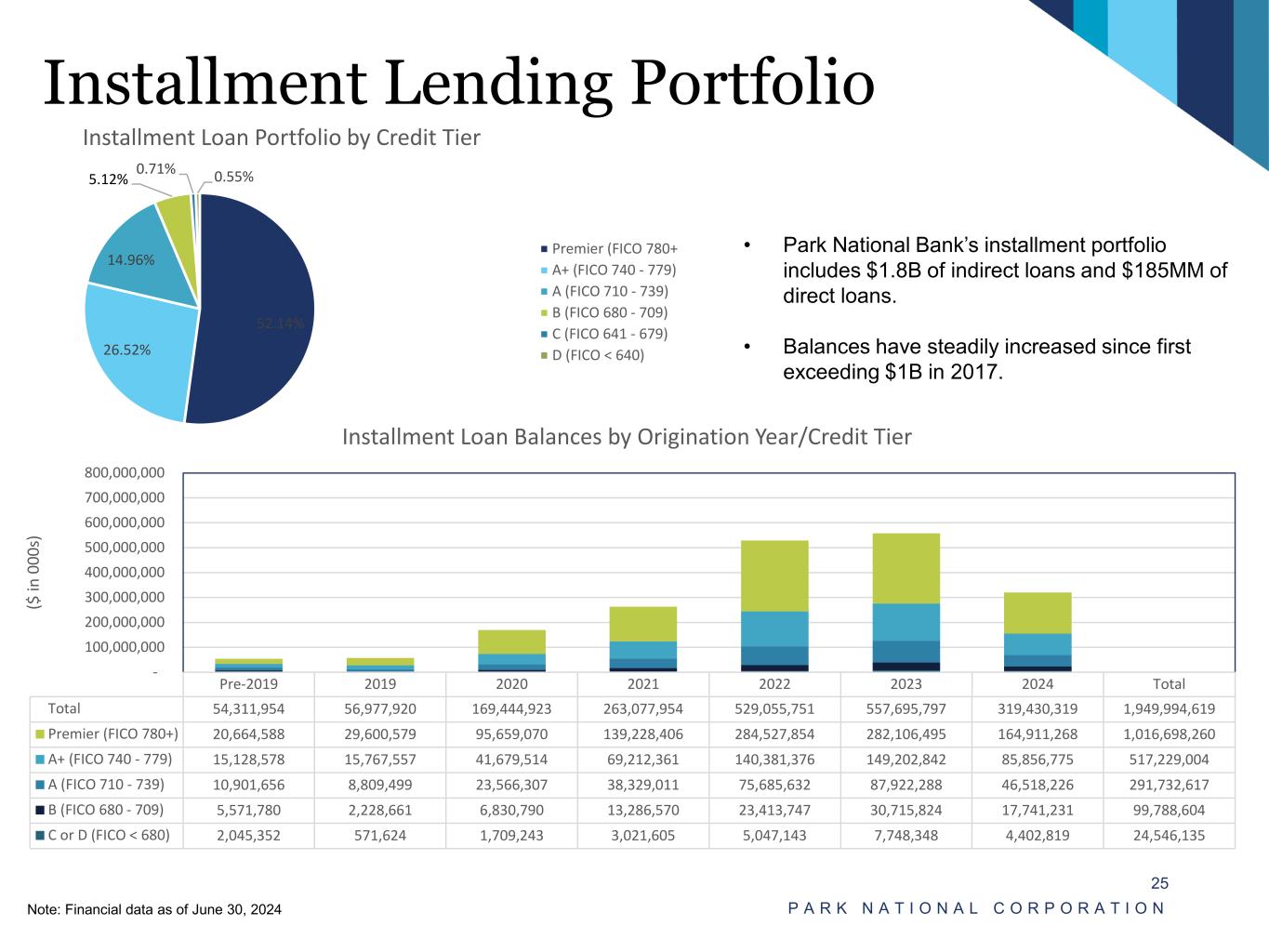Installment Lending Portfolio P A R K N A T I O N A L C O R P O R A T I O N 25 Note: Financial data as of June 30, 2024 • Park National Bank’s installment portfolio includes $1.8B of indirect loans and $185MM of direct loans. • Balances have steadily increased since first exceeding $1B in 2017. 52.14% 26.52% 14.96% 5.12% 0.71% 0.55% Installment Loan Portfolio by Credit Tier Premier (FICO 780+ A+ (FICO 740 - 779) A (FICO 710 - 739) B (FICO 680 - 709) C (FICO 641 - 679) D (FICO < 640) Pre-2019 2019 2020 2021 2022 2023 2024 Total Total 54,311,954 56,977,920 169,444,923 263,077,954 529,055,751 557,695,797 319,430,319 1,949,994,619 Premier (FICO 780+) 20,664,588 29,600,579 95,659,070 139,228,406 284,527,854 282,106,495 164,911,268 1,016,698,260 A+ (FICO 740 - 779) 15,128,578 15,767,557 41,679,514 69,212,361 140,381,376 149,202,842 85,856,775 517,229,004 A (FICO 710 - 739) 10,901,656 8,809,499 23,566,307 38,329,011 75,685,632 87,922,288 46,518,226 291,732,617 B (FICO 680 - 709) 5,571,780 2,228,661 6,830,790 13,286,570 23,413,747 30,715,824 17,741,231 99,788,604 C or D (FICO < 680) 2,045,352 571,624 1,709,243 3,021,605 5,047,143 7,748,348 4,402,819 24,546,135 - 100,000,000 200,000,000 300,000,000 400,000,000 500,000,000 600,000,000 700,000,000 800,000,000 ($ in 0 00 s) Installment Loan Balances by Origination Year/Credit Tier
