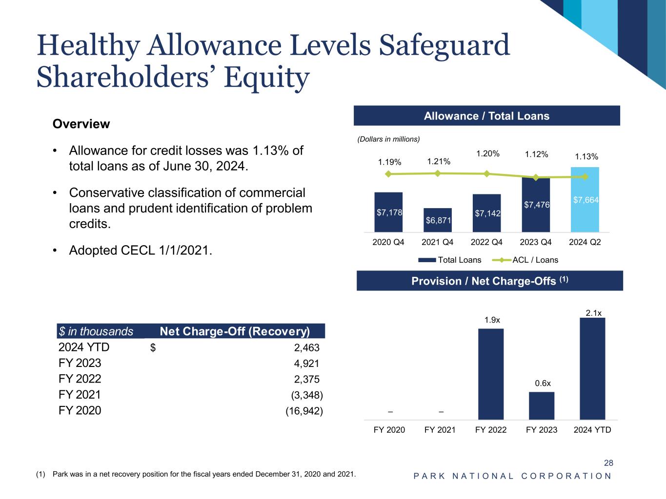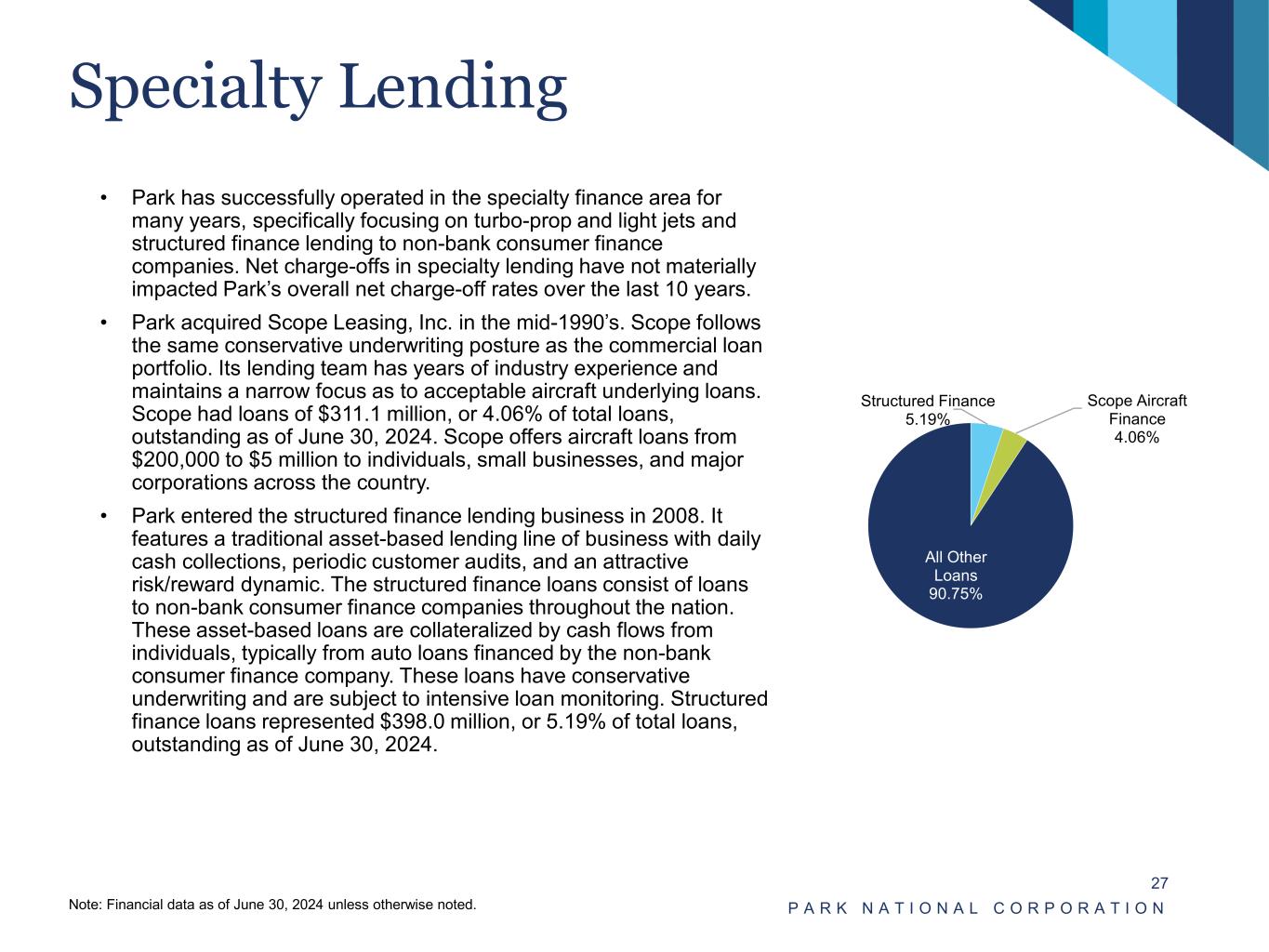 Specialty Lending • Park has successfully operated in the specialty finance area for many years, specifically focusing on turbo-prop and light jets and structured finance lending to non-bank consumer finance companies. Net charge-offs in specialty lending have not materially impacted Park’s overall net charge-off rates over the last 10 years. • Park acquired Scope Leasing, Inc. in the mid-1990’s. Scope follows the same conservative underwriting posture as the commercial loan portfolio. Its lending team has years of industry experience and maintains a narrow focus as to acceptable aircraft underlying loans. Scope had loans of $311.1 million, or 4.06% of total loans, outstanding as of June 30, 2024. Scope offers aircraft loans from $200,000 to $5 million to individuals, small businesses, and major corporations across the country. • Park entered the structured finance lending business in 2008. It features a traditional asset-based lending line of business with daily cash collections, periodic customer audits, and an attractive risk/reward dynamic. The structured finance loans consist of loans to non-bank consumer finance companies throughout the nation. These asset-based loans are collateralized by cash flows from individuals, typically from auto loans financed by the non-bank consumer finance company. These loans have conservative underwriting and are subject to intensive loan monitoring. Structured finance loans represented $398.0 million, or 5.19% of total loans, outstanding as of June 30, 2024. P A R K N A T I O N A L C O R P O R A T I O N 27 Note: Financial data as of June 30, 2024 unless otherwise noted. Structured Finance 5.19% Scope Aircraft Finance 4.06% All Other Loans 90.75%