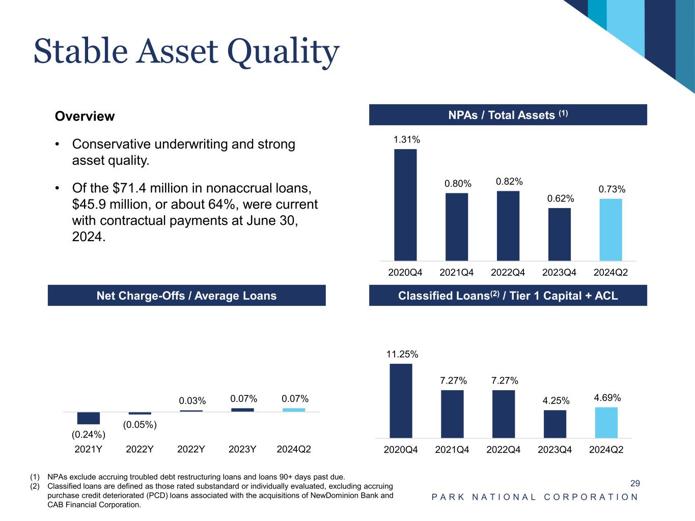 Healthy Allowance Levels Safeguard Shareholders’ Equity P A R K N A T I O N A L C O R P O R A T I O N 28 Allowance / Total LoansOverview • Allowance for credit losses was 1.13% of total loans as of June 30, 2024. • Conservative classification of commercial loans and prudent identification of problem credits. • Adopted CECL 1/1/2021. Provision / Net Charge-Offs (1) (1) Park was in a net recovery position for the fiscal years ended December 31, 2020 and 2021. $7,178 $6,871 $7,142 $7,476 $7,664 1.19% 1.21% 1.20% 1.12% 1.13% 2020 Q4 2021 Q4 2022 Q4 2023 Q4 2024 Q2 (Dollars in millions) Total Loans ACL / Loans $ in thousands Net Charge-Off (Recovery) 2024 YTD 2,463$ FY 2023 4,921 FY 2022 2,375 FY 2021 (3,348) FY 2020 (16,942) – – 1.9x 0.6x 2.1x FY 2020 FY 2021 FY 2022 FY 2023 2024 YTD