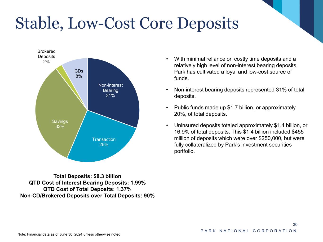 Stable Asset Quality P A R K N A T I O N A L C O R P O R A T I O N 29 Net Charge-Offs / Average Loans Classified Loans(2) / Tier 1 Capital + ACL Overview • Conservative underwriting and strong asset quality. • Of the $71.4 million in nonaccrual loans, $45.9 million, or about 64%, were current with contractual payments at June 30, 2024. NPAs / Total Assets (1) (1) NPAs exclude accruing troubled debt restructuring loans and loans 90+ days past due. (2) Classified loans are defined as those rated substandard or individually evaluated, excluding accruing purchase credit deteriorated (PCD) loans associated with the acquisitions of NewDominion Bank and CAB Financial Corporation. 1.31% 0.80% 0.82% 0.62% 0.73% 2020Q4 2021Q4 2022Q4 2023Q4 2024Q2 (0.24%) (0.05%) 0.03% 0.07% 0.07% (0.70%) (0.20%) 0.30% 0.80% 1.30% 1.80% 2021Y 2022Y 2022Y 2023Y 2024Q2 11.25% 7.27% 7.27% 4.25% 4.69% 2020Q4 2021Q4 2022Q4 2023Q4 2024Q2