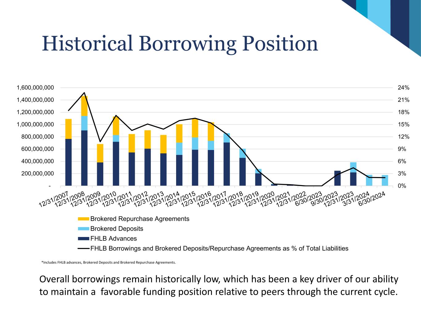 Historical Borrowing Position Overall borrowings remain historically low, which has been a key driver of our ability to maintain a favorable funding position relative to peers through the current cycle. *Includes FHLB advances, Brokered Deposits and Brokered Repurchase Agreements. 0% 3% 6% 9% 12% 15% 18% 21% 24% - 200,000,000 400,000,000 600,000,000 800,000,000 1,000,000,000 1,200,000,000 1,400,000,000 1,600,000,000 Brokered Repurchase Agreements Brokered Deposits FHLB Advances FHLB Borrowings and Brokered Deposits/Repurchase Agreements as % of Total Liabilities