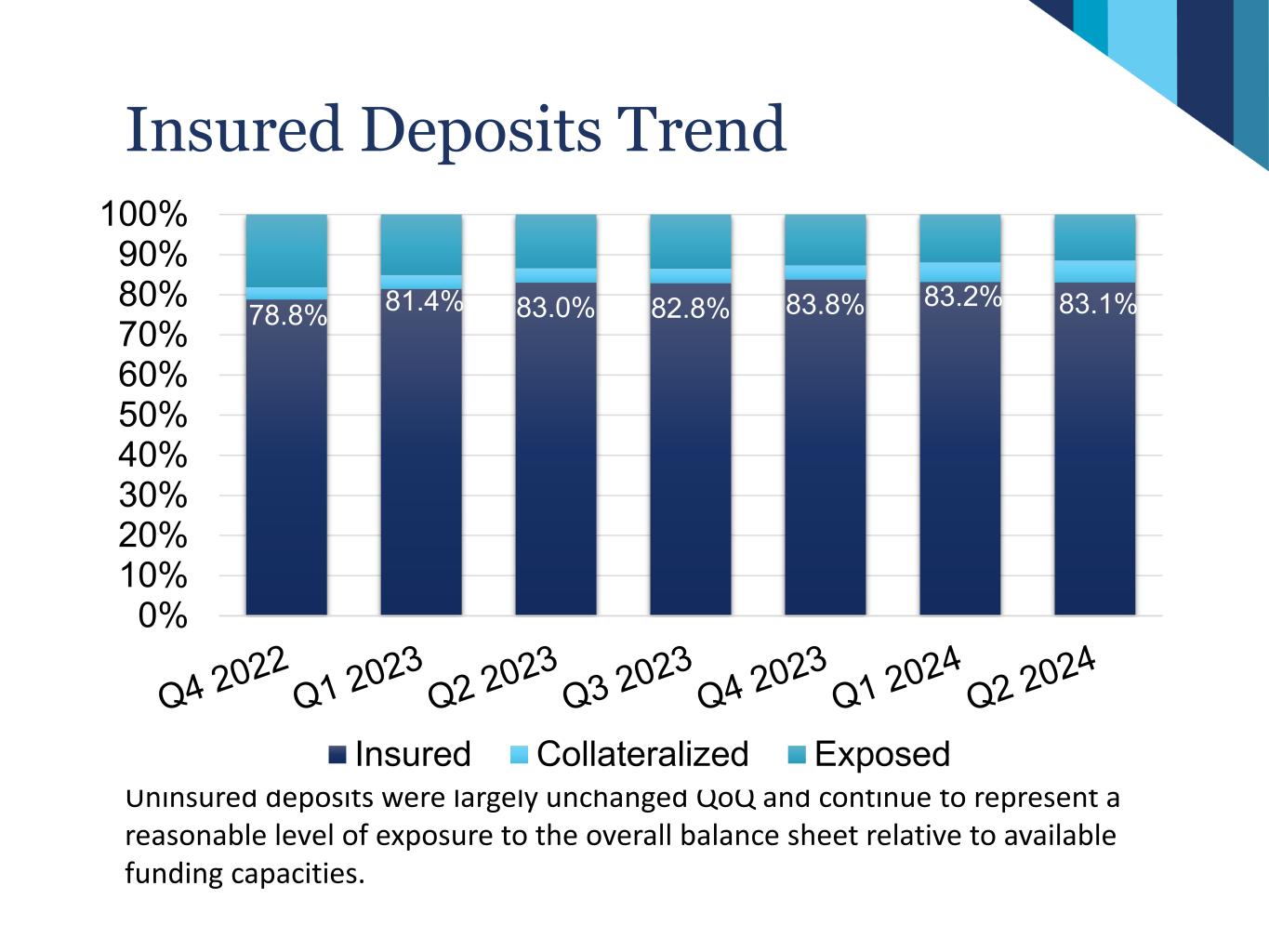 Insured Deposits Trend Uninsured deposits were largely unchanged QoQ and continue to represent a reasonable level of exposure to the overall balance sheet relative to available funding capacities. 78.8% 81.4% 83.0% 82.8% 83.8% 83.2% 83.1% 0% 10% 20% 30% 40% 50% 60% 70% 80% 90% 100% Insured Collateralized Exposed