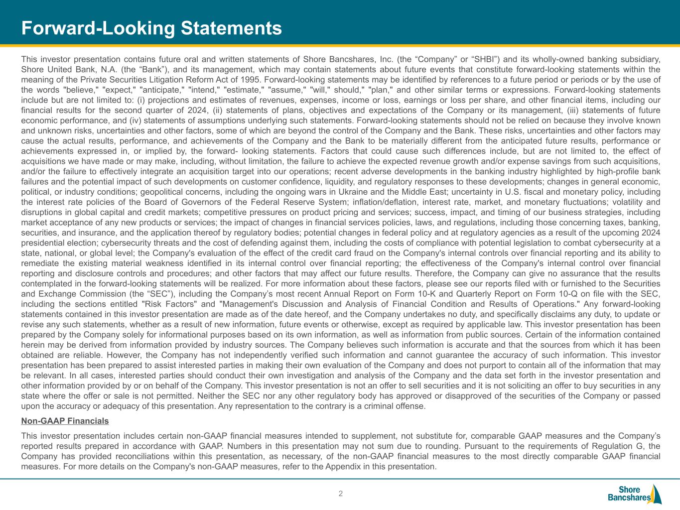 #006881 #ACC0C6 #83AFB4 #FEBE10 #5F574F #4D4F53 #C75B12 #5B8F22 #593160 Forward-Looking Statements This investor presentation contains future oral and written statements of Shore Bancshares, Inc. (the “Company” or “SHBI”) and its wholly-owned banking subsidiary, Shore United Bank, N.A. (the “Bank”), and its management, which may contain statements about future events that constitute forward-looking statements within the meaning of the Private Securities Litigation Reform Act of 1995. Forward-looking statements may be identified by references to a future period or periods or by the use of the words "believe," "expect," "anticipate," "intend," "estimate," "assume," "will," should," "plan," and other similar terms or expressions. Forward-looking statements include but are not limited to: (i) projections and estimates of revenues, expenses, income or loss, earnings or loss per share, and other financial items, including our financial results for the second quarter of 2024, (ii) statements of plans, objectives and expectations of the Company or its management, (iii) statements of future economic performance, and (iv) statements of assumptions underlying such statements. Forward-looking statements should not be relied on because they involve known and unknown risks, uncertainties and other factors, some of which are beyond the control of the Company and the Bank. These risks, uncertainties and other factors may cause the actual results, performance, and achievements of the Company and the Bank to be materially different from the anticipated future results, performance or achievements expressed in, or implied by, the forward- looking statements. Factors that could cause such differences include, but are not limited to, the effect of acquisitions we have made or may make, including, without limitation, the failure to achieve the expected revenue growth and/or expense savings from such acquisitions, and/or the failure to effectively integrate an acquisition target into our operations; recent adverse developments in the banking industry highlighted by high-profile bank failures and the potential impact of such developments on customer confidence, liquidity, and regulatory responses to these developments; changes in general economic, political, or industry conditions; geopolitical concerns, including the ongoing wars in Ukraine and the Middle East; uncertainty in U.S. fiscal and monetary policy, including the interest rate policies of the Board of Governors of the Federal Reserve System; inflation/deflation, interest rate, market, and monetary fluctuations; volatility and disruptions in global capital and credit markets; competitive pressures on product pricing and services; success, impact, and timing of our business strategies, including market acceptance of any new products or services; the impact of changes in financial services policies, laws, and regulations, including those concerning taxes, banking, securities, and insurance, and the application thereof by regulatory bodies; potential changes in federal policy and at regulatory agencies as a result of the upcoming 2024 presidential election; cybersecurity threats and the cost of defending against them, including the costs of compliance with potential legislation to combat cybersecurity at a state, national, or global level; the Company's evaluation of the effect of the credit card fraud on the Company's internal controls over financial reporting and its ability to remediate the existing material weakness identified in its internal control over financial reporting; the effectiveness of the Company's internal control over financial reporting and disclosure controls and procedures; and other factors that may affect our future results. Therefore, the Company can give no assurance that the results contemplated in the forward-looking statements will be realized. For more information about these factors, please see our reports filed with or furnished to the Securities and Exchange Commission (the “SEC”), including the Company’s most recent Annual Report on Form 10-K and Quarterly Report on Form 10-Q on file with the SEC, including the sections entitled "Risk Factors" and "Management's Discussion and Analysis of Financial Condition and Results of Operations." Any forward-looking statements contained in this investor presentation are made as of the date hereof, and the Company undertakes no duty, and specifically disclaims any duty, to update or revise any such statements, whether as a result of new information, future events or otherwise, except as required by applicable law. This investor presentation has been prepared by the Company solely for informational purposes based on its own information, as well as information from public sources. Certain of the information contained herein may be derived from information provided by industry sources. The Company believes such information is accurate and that the sources from which it has been obtained are reliable. However, the Company has not independently verified such information and cannot guarantee the accuracy of such information. This investor presentation has been prepared to assist interested parties in making their own evaluation of the Company and does not purport to contain all of the information that may be relevant. In all cases, interested parties should conduct their own investigation and analysis of the Company and the data set forth in the investor presentation and other information provided by or on behalf of the Company. This investor presentation is not an offer to sell securities and it is not soliciting an offer to buy securities in any state where the offer or sale is not permitted. Neither the SEC nor any other regulatory body has approved or disapproved of the securities of the Company or passed upon the accuracy or adequacy of this presentation. Any representation to the contrary is a criminal offense. Non-GAAP Financials This investor presentation includes ce
