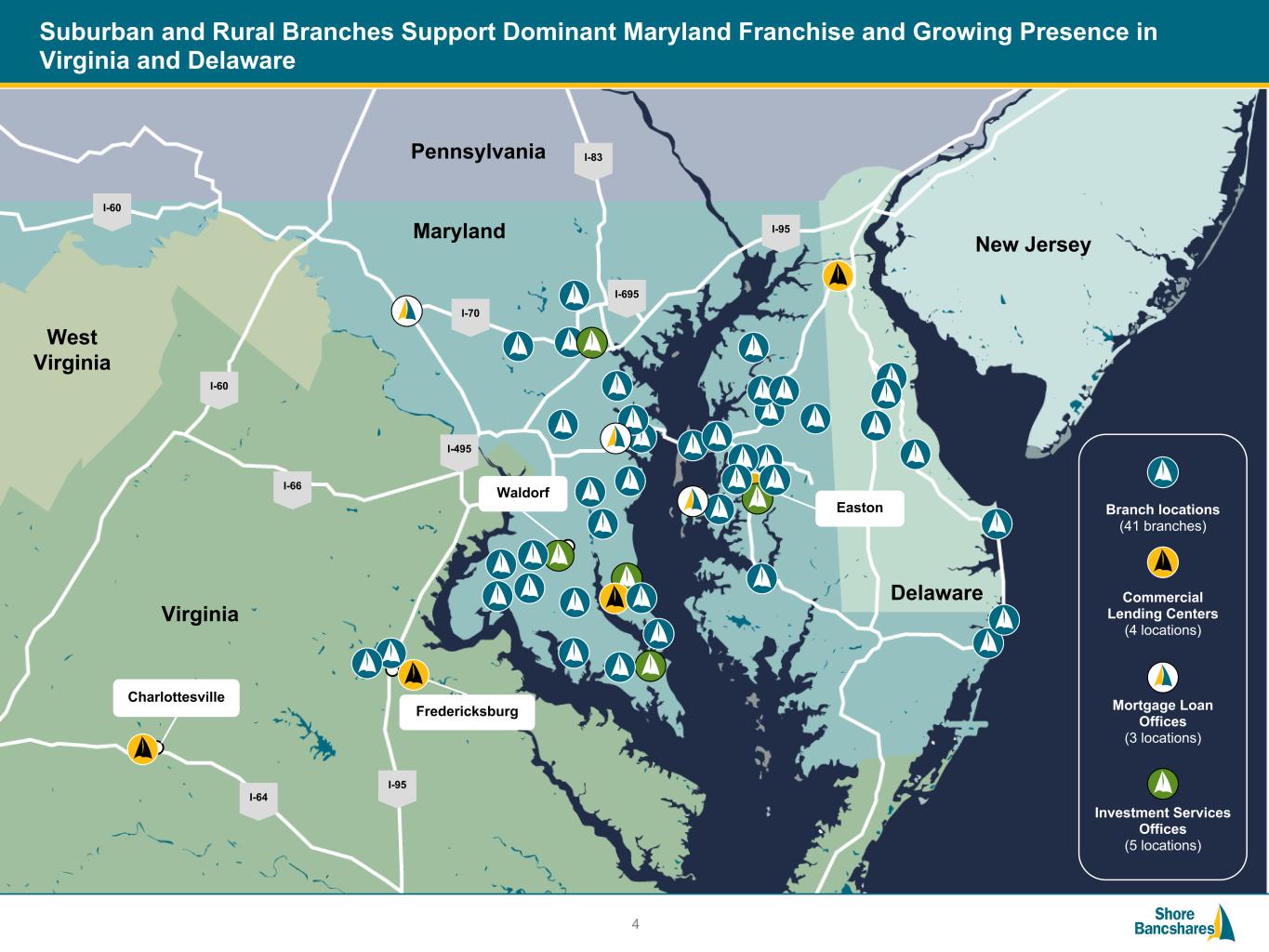 #006881 #ACC0C6 #83AFB4 #FEBE10 #5F574F #4D4F53 #C75B12 #5B8F22 #593160 Suburban and Rural Branches Support Dominant Maryland Franchise and Growing Presence in Virginia and Delaware 4 Branch locations (41 branches) Commercial Lending Centers (4 locations) Mortgage Loan Offices (3 locations) Pennsylvania West Virginia Virginia Delaware New Jersey Maryland I-60 I-60 I-83 I-95 I-695 I-70 I-495 I-66 I-95 I-64 Fredericksburg Charlottesville Waldorf Easton Investment Services Offices (5 locations) Maryland