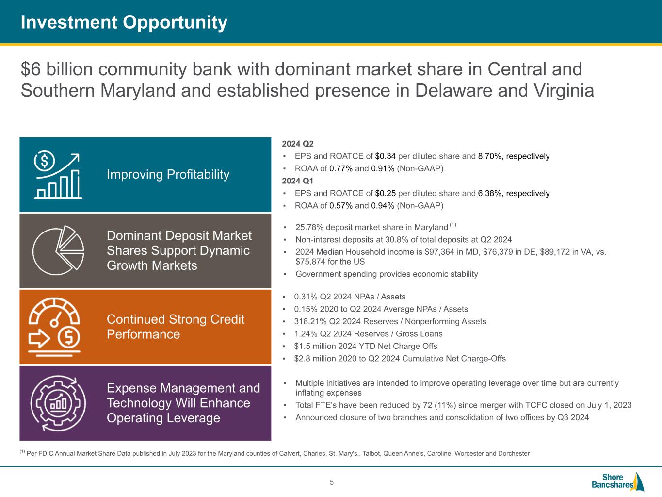 #006881 #ACC0C6 #83AFB4 #FEBE10 #5F574F #4D4F53 #C75B12 #5B8F22 #593160 Forward-Looking Statements This investor presentation contains future oral and written statements of Shore Bancshares, Inc. (the “Company” or “SHBI”) and its wholly-owned banking subsidiary, Shore United Bank, N.A. (the “Bank”), and its management, which may contain statements about future events that constitute forward-looking statements within the meaning of the Private Securities Litigation Reform Act of 1995. Forward-looking statements may be identified by references to a future period or periods or by the use of the words "believe," "expect," "anticipate," "intend," "estimate," "assume," "will," should," "plan," and other similar terms or expressions. Forward-looking statements include but are not limited to: (i) projections and estimates of revenues, expenses, income or loss, earnings or loss per share, and other financial items, including our financial results for the second quarter of 2024, (ii) statements of plans, objectives and expectations of the Company or its management, (iii) statements of future economic performance, and (iv) statements of assumptions underlying such statements. Forward-looking statements should not be relied on because they involve known and unknown risks, uncertainties and other factors, some of which are beyond the control of the Company and the Bank. These risks, uncertainties and other factors may cause the actual results, performance, and achievements of the Company and the Bank to be materially different from the anticipated future results, performance or achievements expressed in, or implied by, the forward- looking statements. Factors that could cause such differences include, but are not limited to, the effect of acquisitions we have made or may make, including, without limitation, the failure to achieve the expected revenue growth and/or expense savings from such acquisitions, and/or the failure to effectively integrate an acquisition target into our operations; recent adverse developments in the banking industry highlighted by high-profile bank failures and the potential impact of such developments on customer confidence, liquidity, and regulatory responses to these developments; changes in general economic, political, or industry conditions; geopolitical concerns, including the ongoing wars in Ukraine and the Middle East; uncertainty in U.S. fiscal and monetary policy, including the interest rate policies of the Board of Governors of the Federal Reserve System; inflation/deflation, interest rate, market, and monetary fluctuations; volatility and disruptions in global capital and credit markets; competitive pressures on product pricing and services; success, impact, and timing of our business strategies, including market acceptance of any new products or services; the impact of changes in financial services policies, laws, and regulations, including those concerning taxes, banking, securities, and insurance, and the application thereof by regulatory bodies; potential changes in federal policy and at regulatory agencies as a result of the upcoming 2024 presidential election; cybersecurity threats and the cost of defending against them, including the costs of compliance with potential legislation to combat cybersecurity at a state, national, or global level; the Company's evaluation of the effect of the credit card fraud on the Company's internal controls over financial reporting and its ability to remediate the existing material weakness identified in its internal control over financial reporting; the effectiveness of the Company's internal control over financial reporting and disclosure controls and procedures; and other factors that may affect our future results. Therefore, the Company can give no assurance that the results contemplated in the forward-looking statements will be realized. For more information about these factors, please see our reports filed with or furnished to the Securities and Exchange Commission (the “SEC”), including the Company’s most recent Annual Report on Form 10-K and Quarterly Report on Form 10-Q on file with the SEC, including the sections entitled "Risk Factors" and "Management's Discussion and Analysis of Financial Condition and Results of Operations." Any forward-looking statements contained in this investor presentation are made as of the date hereof, and the Company undertakes no duty, and specifically disclaims any duty, to update or revise any such statements, whether as a result of new information, future events or otherwise, except as required by applicable law. This investor presentation has been prepared by the Company solely for informational purposes based on its own information, as well as information from public sources. Certain of the information contained herein may be derived from information provided by industry sources. The Company believes such information is accurate and that the sources from which it has been obtained are reliable. However, the Company has not independently verified such information and cannot guarantee the accuracy of such information. This investor presentation has been prepared to assist interested parties in making their own evaluation of the Company and does not purport to contain all of the information that may be relevant. In all cases, interested parties should conduct their own investigation and analysis of the Company and the data set forth in the investor presentation and other information provided by or on behalf of the Company. This investor presentation is not an offer to sell securities and it is not soliciting an offer to buy securities in any state where the offer or sale is not permitted. Neither the SEC nor any other regulatory body has approved or disapproved of the securities of the Company or passed upon the accuracy or adequacy of this presentation. Any representation to the contrary is a criminal offense. Non-GAAP Financials This investor presentation includes ce