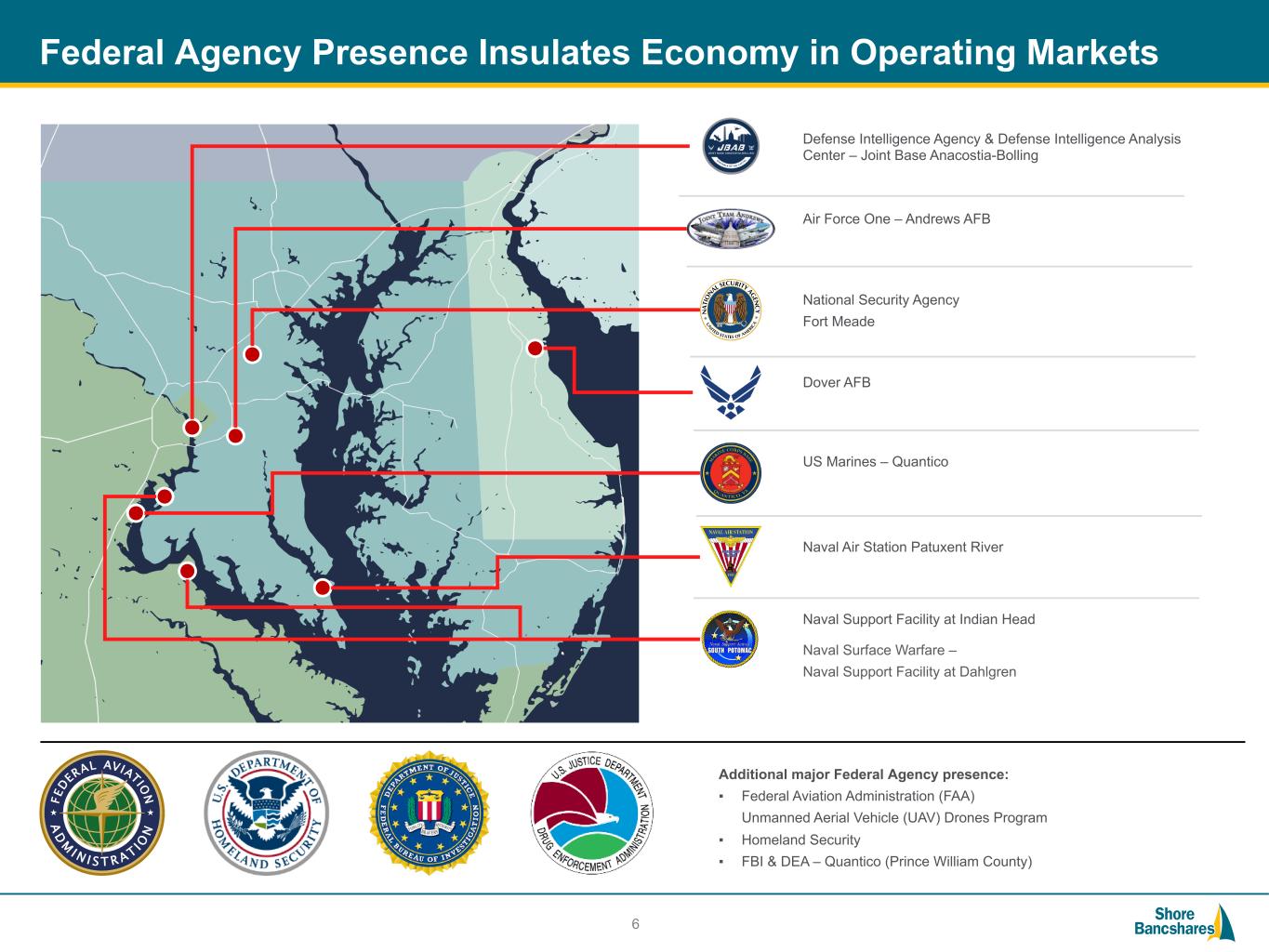 #006881 #ACC0C6 #83AFB4 #FEBE10 #5F574F #4D4F53 #C75B12 #5B8F22 #593160 Investment Opportunity 2024 Q2 ▪ EPS and ROATCE of $0.34 per diluted share and 8.70%, respectively ▪ ROAA of 0.77% and 0.91% (Non-GAAP) 2024 Q1 ▪ EPS and ROATCE of $0.25 per diluted share and 6.38%, respectively ▪ ROAA of 0.57% and 0.94% (Non-GAAP) Improving Profitability Dominant Deposit Market Shares Support Dynamic Growth Markets Continued Strong Credit Performance Expense Management and Technology Will Enhance Operating Leverage ▪ 25.78% deposit market share in Maryland (1) ▪ Non-interest deposits at 30.8% of total deposits at Q2 2024 ▪ 2024 Median Household income is $97,364 in MD, $76,379 in DE, $89,172 in VA, vs. $75,874 for the US ▪ Government spending provides economic stability ▪ 0.31% Q2 2024 NPAs / Assets ▪ 0.15% 2020 to Q2 2024 Average NPAs / Assets ▪ 318.21% Q2 2024 Reserves / Nonperforming Assets ▪ 1.24% Q2 2024 Reserves / Gross Loans ▪ $1.5 million 2024 YTD Net Charge Offs ▪ $2.8 million 2020 to Q2 2024 Cumulative Net Charge-Offs ▪ Multiple initiatives are intended to improve operating leverage over time but are currently inflating expenses ▪ Total FTE's have been reduced by 72 (11%) since merger with TCFC closed on July 1, 2023 ▪ Announced closure of two branches and consolidation of two offices by Q3 2024 5 $6 billion community bank with dominant market share in Central and Southern Maryland and established presence in Delaware and Virginia (1) Per FDIC Annual Market Share Data published in July 2023 for the Maryland counties of Calvert, Charles, St. Mary's., Talbot, Queen Anne's, Caroline, Worcester and Dorchester