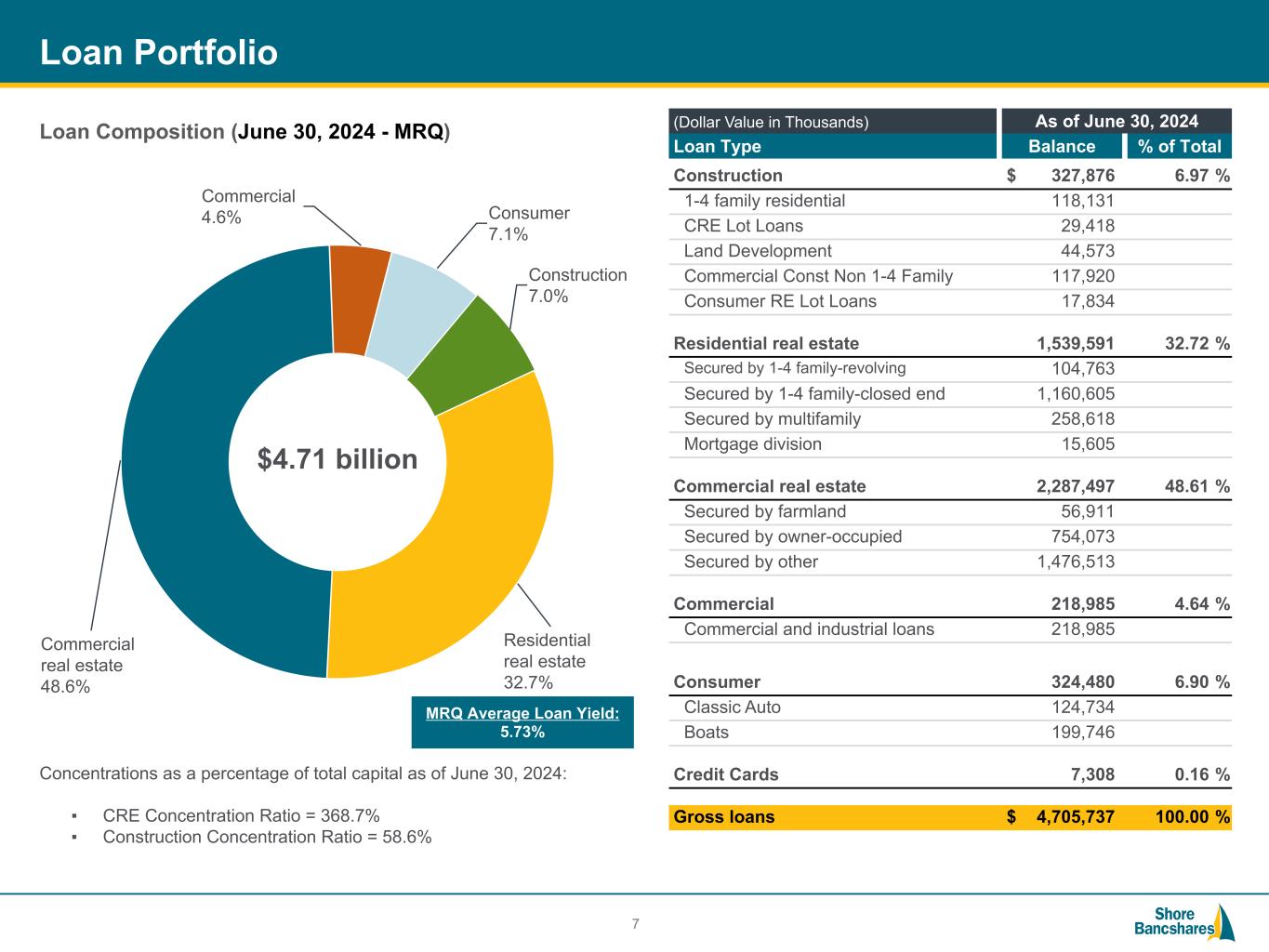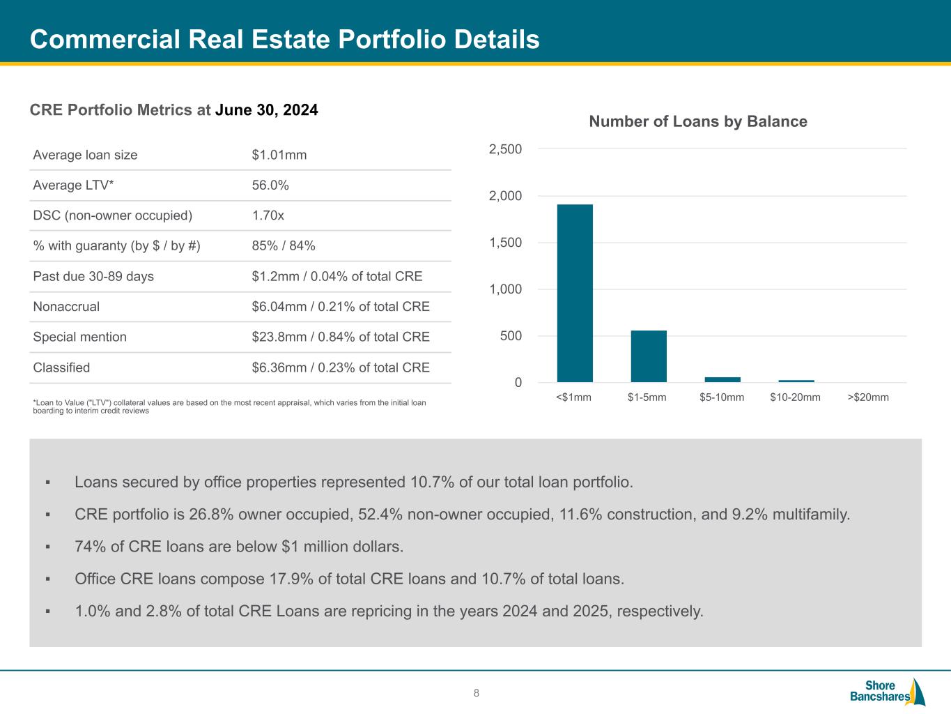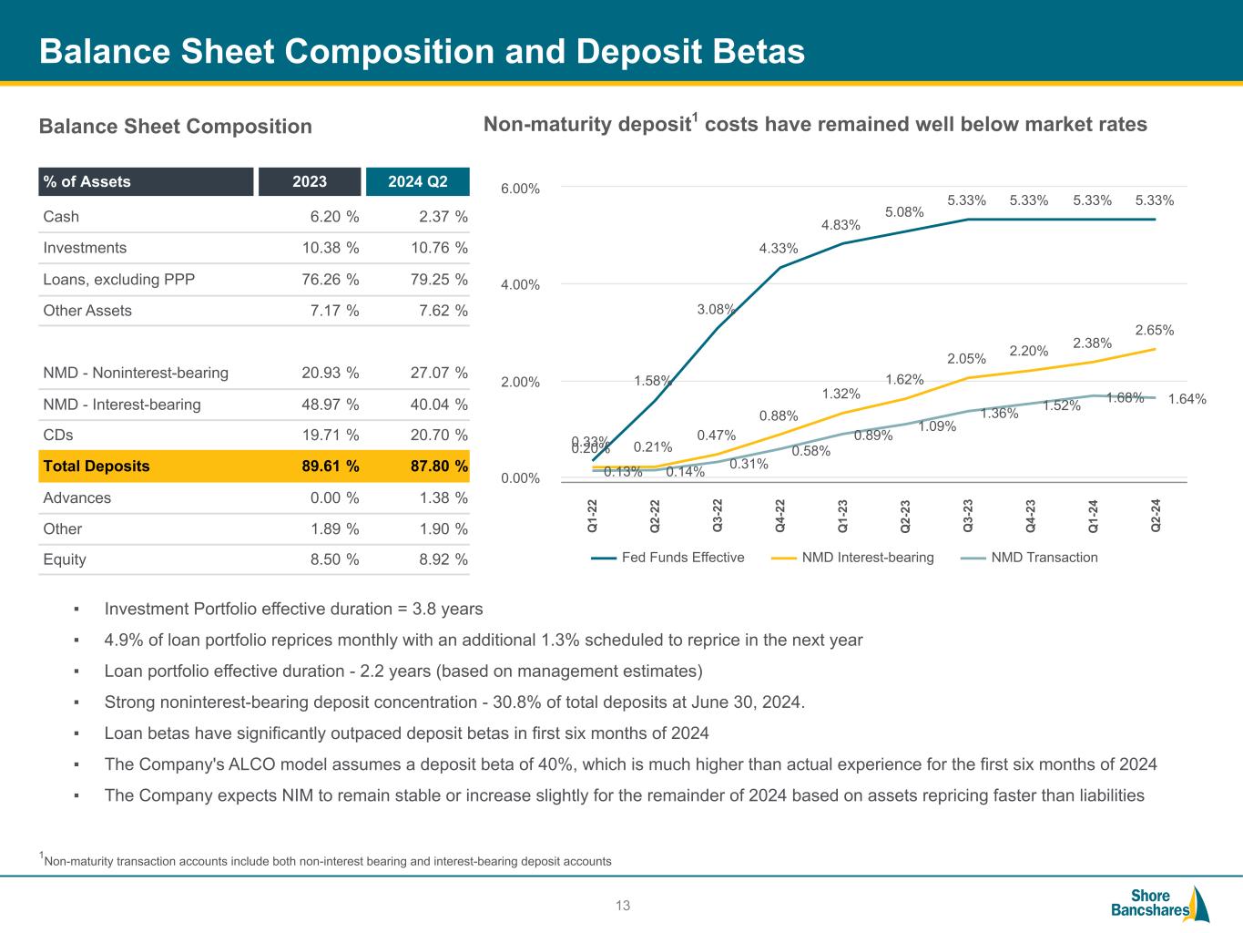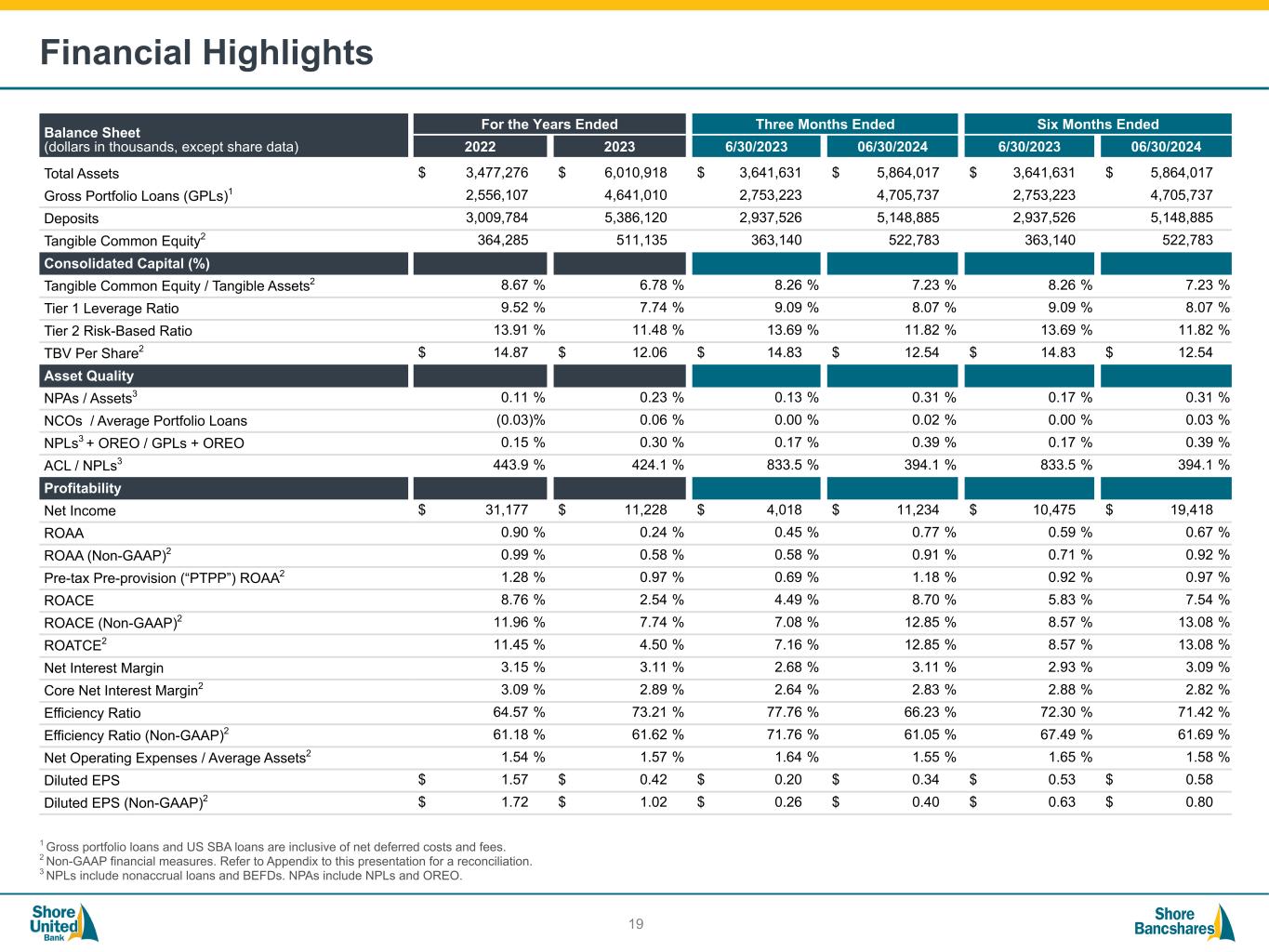 #006881 #ACC0C6 #83AFB4 #FEBE10 #5F574F #4D4F53 #C75B12 #5B8F22 #593160 Shore Bancshares, Inc. (NASDAQ: SHBI) (1) Allowance for Credit Losses ("ACL"), Nonperforming Assets (“NPAs”) includes Other Real Estate Owned ("OREO"), Loan Modifications to Borrowers Experiencing Financial Difficulty ("BEFDs") (2) Return on Average Assets ("ROAA"), Tangible Common Equity (“TCE”), Tangible Assets, Return on Average TCE (“ROATCE”), Efficiency Ratio, and Tangible Book Value (“TBV”) are non-GAAP measures - see reconciliations in Appendix 3 Balance Sheet ($ Billions) 2020 2021 2022 2023 2024 Q1 2024 Q2 Assets $ 1.93 $ 3.46 $ 3.48 $ 6.01 $ 5.83 $ 5.86 Gross Portfolio Loans 1.45 2.12 2.56 4.64 4.65 4.71 Deposits 1.70 3.03 3.01 5.39 5.18 5.15 NPAs(1) / Assets 0.32 % 0.09 % 0.11 % 0.23 % 0.28 % 0.31 % ACL / NPAs + BEFDs(1) 104.77 % 160.07 % 199.29 % 418.59 % 350.46 % 318.21 % TCE / Tangible Assets (Non-GAAP)(2) 9.18 % 8.25 % 8.67 % 6.78 % 7.11 % 7.23 % Risk-Based Capital Ratio 14.25 % 15.36 % 13.91 % 11.48 % 11.68 % 11.82 % 2020 2021 2022 2023 2024 Q1 2024 Q2 ROAA 0.92 % 0.66 % 0.90 % 0.24 % 0.57 % 0.77 % ROAA (Non-GAAP)(2) 0.94 % 0.95 % 0.99 % 0.58 % 0.94 % 0.91 % ROATCE (Non-GAAP)(2) 9.04 % 11.34 % 11.96 % 7.74 % 13.39 % 12.85 % Cost of Deposits 0.43 % 0.22 % 0.33 % 1.71 % 2.23 % 2.19 % Net Interest Margin ("NIM") 3.27 % 2.94 % 3.15 % 3.11 % 3.08 % 3.11 % Efficiency Ratio (Non-GAAP)(2) 59.56 % 61.15 % 61.18 % 61.62 % 62.37 % 61.05 % Diluted Earnings Per Share $ 1.27 $ 1.17 $ 1.57 $ 0.42 $ 0.25 $ 0.34 TBV Per Share (Non-GAAP)(2) $ 14.92 $ 14.12 $ 14.87 $ 12.06 $ 12.24 $ 12.54 2024 Insurance, Trust & Wealth Management offered Shore United / Community Financial merger Centreville National Bank of MD founded Shore United Bank rebranding Shore Bancshares acquires Talbot Bank 202320212016200420022000199618851876 Shore Bancshares, Inc. formed Shore United / Severn merger Talbot Bank of Easton founded Expansion into Delaware $5.8 billion community bank with operations in MD, DE and VA Financial Performance