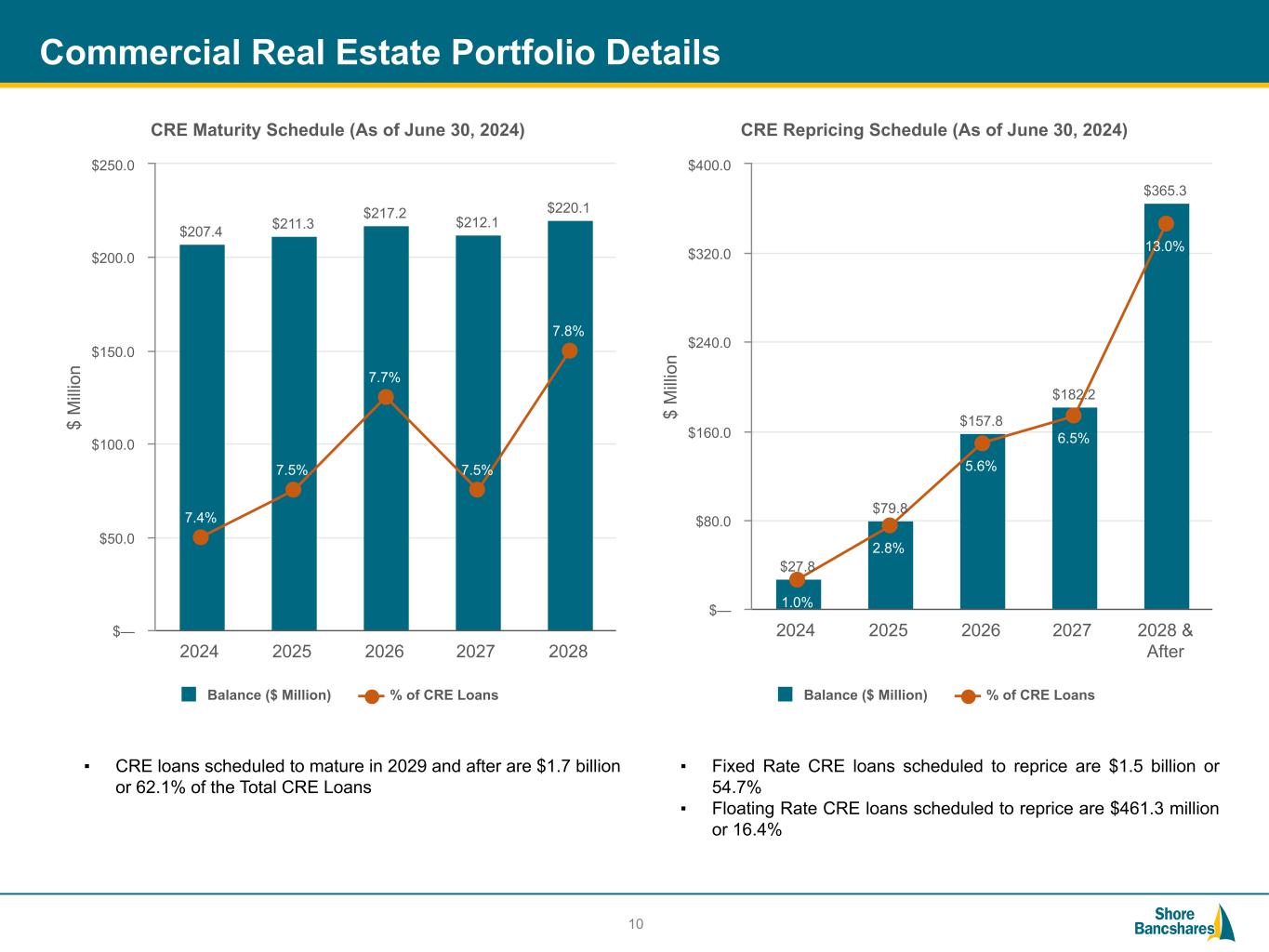 #006881 #ACC0C6 #83AFB4 #FEBE10 #5F574F #4D4F53 #C75B12 #5B8F22 #593160 Commercial Real Estate Portfolio Details CRE Portfolio Composition (As of June 30, 2024) Multifamily, 9.5% Industrial, 11.8% Office, 17.9% Retail, 18.2% Other, 34.9% Hotel/Motel, 7.6% 9 Geography (As of June 30, 2024) MD, 54.6% VA, 24.2% DE, 8.3% Other, 12.9% CRE Portfolio Composition Amount ($000) % of CRE Loans Multifamily $ 268,015 9.5 % Industrial 333,547 11.8 % Retail 512,773 18.2 % Other 983,462 34.9 % Hotel/Motel 214,410 7.6 % Office 504,869 17.9 % Grand Total $ 2,817,076 100.0 % Location Loan Count Amount ($000) % of Total Office Metropolitian(1) 14 $ 14,110 2.8 % Suburban 335 380,684 75.4 % Rural 158 110,075 21.8 % Grand Total 507 $ 504,869 100.0 % (1) Metropolitan includes major cities of Baltimore, Alexandria and Washington DC Office