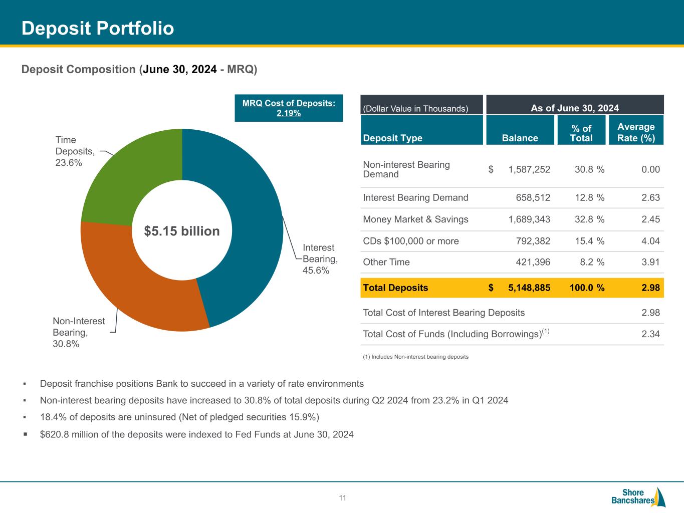 #006881 #ACC0C6 #83AFB4 #FEBE10 #5F574F #4D4F53 #C75B12 #5B8F22 #593160 Forward-Looking Statements This investor presentation contains future oral and written statements of Shore Bancshares, Inc. (the “Company” or “SHBI”) and its wholly-owned banking subsidiary, Shore United Bank, N.A. (the “Bank”), and its management, which may contain statements about future events that constitute forward-looking statements within the meaning of the Private Securities Litigation Reform Act of 1995. Forward-looking statements may be identified by references to a future period or periods or by the use of the words "believe," "expect," "anticipate," "intend," "estimate," "assume," "will," should," "plan," and other similar terms or expressions. Forward-looking statements include but are not limited to: (i) projections and estimates of revenues, expenses, income or loss, earnings or loss per share, and other financial items, including our financial results for the second quarter of 2024, (ii) statements of plans, objectives and expectations of the Company or its management, (iii) statements of future economic performance, and (iv) statements of assumptions underlying such statements. Forward-looking statements should not be relied on because they involve known and unknown risks, uncertainties and other factors, some of which are beyond the control of the Company and the Bank. These risks, uncertainties and other factors may cause the actual results, performance, and achievements of the Company and the Bank to be materially different from the anticipated future results, performance or achievements expressed in, or implied by, the forward- looking statements. Factors that could cause such differences include, but are not limited to, the effect of acquisitions we have made or may make, including, without limitation, the failure to achieve the expected revenue growth and/or expense savings from such acquisitions, and/or the failure to effectively integrate an acquisition target into our operations; recent adverse developments in the banking industry highlighted by high-profile bank failures and the potential impact of such developments on customer confidence, liquidity, and regulatory responses to these developments; changes in general economic, political, or industry conditions; geopolitical concerns, including the ongoing wars in Ukraine and the Middle East; uncertainty in U.S. fiscal and monetary policy, including the interest rate policies of the Board of Governors of the Federal Reserve System; inflation/deflation, interest rate, market, and monetary fluctuations; volatility and disruptions in global capital and credit markets; competitive pressures on product pricing and services; success, impact, and timing of our business strategies, including market acceptance of any new products or services; the impact of changes in financial services policies, laws, and regulations, including those concerning taxes, banking, securities, and insurance, and the application thereof by regulatory bodies; potential changes in federal policy and at regulatory agencies as a result of the upcoming 2024 presidential election; cybersecurity threats and the cost of defending against them, including the costs of compliance with potential legislation to combat cybersecurity at a state, national, or global level; the Company's evaluation of the effect of the credit card fraud on the Company's internal controls over financial reporting and its ability to remediate the existing material weakness identified in its internal control over financial reporting; the effectiveness of the Company's internal control over financial reporting and disclosure controls and procedures; and other factors that may affect our future results. Therefore, the Company can give no assurance that the results contemplated in the forward-looking statements will be realized. For more information about these factors, please see our reports filed with or furnished to the Securities and Exchange Commission (the “SEC”), including the Company’s most recent Annual Report on Form 10-K and Quarterly Report on Form 10-Q on file with the SEC, including the sections entitled "Risk Factors" and "Management's Discussion and Analysis of Financial Condition and Results of Operations." Any forward-looking statements contained in this investor presentation are made as of the date hereof, and the Company undertakes no duty, and specifically disclaims any duty, to update or revise any such statements, whether as a result of new information, future events or otherwise, except as required by applicable law. This investor presentation has been prepared by the Company solely for informational purposes based on its own information, as well as information from public sources. Certain of the information contained herein may be derived from information provided by industry sources. The Company believes such information is accurate and that the sources from which it has been obtained are reliable. However, the Company has not independently verified such information and cannot guarantee the accuracy of such information. This investor presentation has been prepared to assist interested parties in making their own evaluation of the Company and does not purport to contain all of the information that may be relevant. In all cases, interested parties should conduct their own investigation and analysis of the Company and the data set forth in the investor presentation and other information provided by or on behalf of the Company. This investor presentation is not an offer to sell securities and it is not soliciting an offer to buy securities in any state where the offer or sale is not permitted. Neither the SEC nor any other regulatory body has approved or disapproved of the securities of the Company or passed upon the accuracy or adequacy of this presentation. Any representation to the contrary is a criminal offense. Non-GAAP Financials This investor presentation includes ce