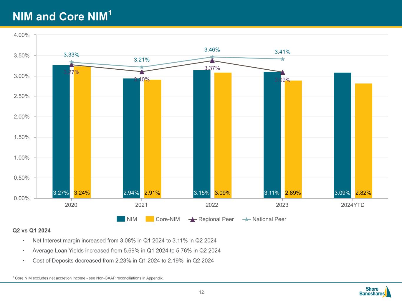#006881 #ACC0C6 #83AFB4 #FEBE10 #5F574F #4D4F53 #C75B12 #5B8F22 #593160 Forward-Looking Statements This investor presentation contains future oral and written statements of Shore Bancshares, Inc. (the “Company” or “SHBI”) and its wholly-owned banking subsidiary, Shore United Bank, N.A. (the “Bank”), and its management, which may contain statements about future events that constitute forward-looking statements within the meaning of the Private Securities Litigation Reform Act of 1995. Forward-looking statements may be identified by references to a future period or periods or by the use of the words "believe," "expect," "anticipate," "intend," "estimate," "assume," "will," should," "plan," and other similar terms or expressions. Forward-looking statements include but are not limited to: (i) projections and estimates of revenues, expenses, income or loss, earnings or loss per share, and other financial items, including our financial results for the second quarter of 2024, (ii) statements of plans, objectives and expectations of the Company or its management, (iii) statements of future economic performance, and (iv) statements of assumptions underlying such statements. Forward-looking statements should not be relied on because they involve known and unknown risks, uncertainties and other factors, some of which are beyond the control of the Company and the Bank. These risks, uncertainties and other factors may cause the actual results, performance, and achievements of the Company and the Bank to be materially different from the anticipated future results, performance or achievements expressed in, or implied by, the forward- looking statements. Factors that could cause such differences include, but are not limited to, the effect of acquisitions we have made or may make, including, without limitation, the failure to achieve the expected revenue growth and/or expense savings from such acquisitions, and/or the failure to effectively integrate an acquisition target into our operations; recent adverse developments in the banking industry highlighted by high-profile bank failures and the potential impact of such developments on customer confidence, liquidity, and regulatory responses to these developments; changes in general economic, political, or industry conditions; geopolitical concerns, including the ongoing wars in Ukraine and the Middle East; uncertainty in U.S. fiscal and monetary policy, including the interest rate policies of the Board of Governors of the Federal Reserve System; inflation/deflation, interest rate, market, and monetary fluctuations; volatility and disruptions in global capital and credit markets; competitive pressures on product pricing and services; success, impact, and timing of our business strategies, including market acceptance of any new products or services; the impact of changes in financial services policies, laws, and regulations, including those concerning taxes, banking, securities, and insurance, and the application thereof by regulatory bodies; potential changes in federal policy and at regulatory agencies as a result of the upcoming 2024 presidential election; cybersecurity threats and the cost of defending against them, including the costs of compliance with potential legislation to combat cybersecurity at a state, national, or global level; the Company's evaluation of the effect of the credit card fraud on the Company's internal controls over financial reporting and its ability to remediate the existing material weakness identified in its internal control over financial reporting; the effectiveness of the Company's internal control over financial reporting and disclosure controls and procedures; and other factors that may affect our future results. Therefore, the Company can give no assurance that the results contemplated in the forward-looking statements will be realized. For more information about these factors, please see our reports filed with or furnished to the Securities and Exchange Commission (the “SEC”), including the Company’s most recent Annual Report on Form 10-K and Quarterly Report on Form 10-Q on file with the SEC, including the sections entitled "Risk Factors" and "Management's Discussion and Analysis of Financial Condition and Results of Operations." Any forward-looking statements contained in this investor presentation are made as of the date hereof, and the Company undertakes no duty, and specifically disclaims any duty, to update or revise any such statements, whether as a result of new information, future events or otherwise, except as required by applicable law. This investor presentation has been prepared by the Company solely for informational purposes based on its own information, as well as information from public sources. Certain of the information contained herein may be derived from information provided by industry sources. The Company believes such information is accurate and that the sources from which it has been obtained are reliable. However, the Company has not independently verified such information and cannot guarantee the accuracy of such information. This investor presentation has been prepared to assist interested parties in making their own evaluation of the Company and does not purport to contain all of the information that may be relevant. In all cases, interested parties should conduct their own investigation and analysis of the Company and the data set forth in the investor presentation and other information provided by or on behalf of the Company. This investor presentation is not an offer to sell securities and it is not soliciting an offer to buy securities in any state where the offer or sale is not permitted. Neither the SEC nor any other regulatory body has approved or disapproved of the securities of the Company or passed upon the accuracy or adequacy of this presentation. Any representation to the contrary is a criminal offense. Non-GAAP Financials This investor presentation includes ce