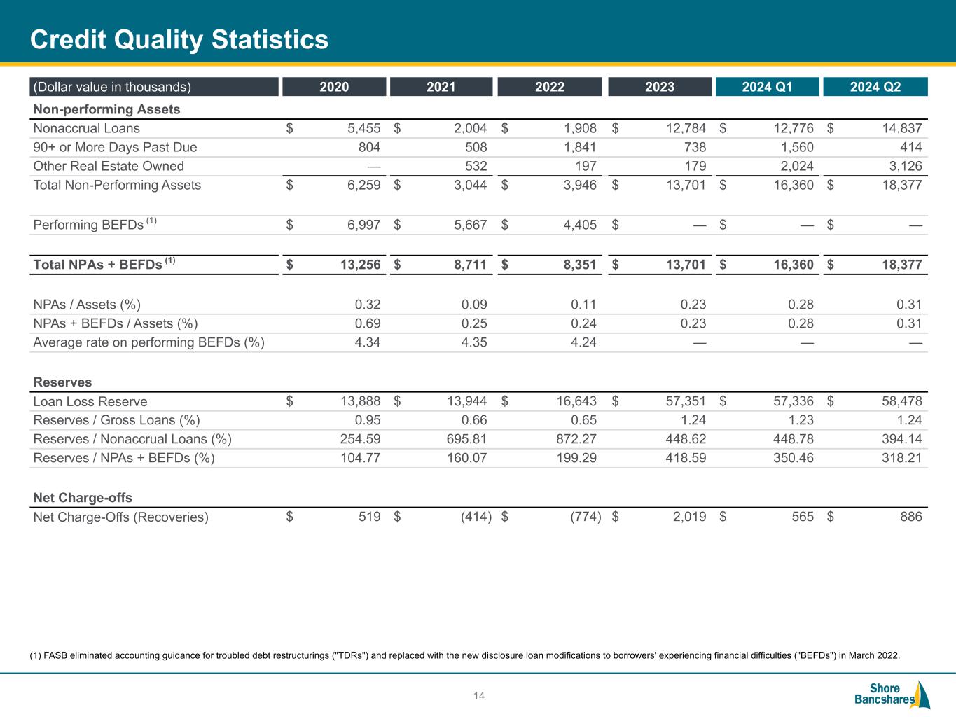 #006881 #ACC0C6 #83AFB4 #FEBE10 #5F574F #4D4F53 #C75B12 #5B8F22 #593160 Credit Quality Statistics 14 (1) FASB eliminated accounting guidance for troubled debt restructurings ("TDRs") and replaced with the new disclosure loan modifications to borrowers' experiencing financial difficulties ("BEFDs") in March 2022. (Dollar value in thousands) 2020 2021 2022 2023 2024 Q1 2024 Q2 Non-performing Assets Nonaccrual Loans $ 5,455 $ 2,004 $ 1,908 $ 12,784 $ 12,776 $ 14,837 90+ or More Days Past Due 804 508 1,841 738 1,560 414 Other Real Estate Owned — 532 197 179 2,024 3,126 Total Non-Performing Assets $ 6,259 $ 3,044 $ 3,946 $ 13,701 $ 16,360 $ 18,377 Performing BEFDs (1) $ 6,997 $ 5,667 $ 4,405 $ — $ — $ — Total NPAs + BEFDs (1) $ 13,256 $ 8,711 $ 8,351 $ 13,701 $ 16,360 $ 18,377 NPAs / Assets (%) 0.32 0.09 0.11 0.23 0.28 0.31 NPAs + BEFDs / Assets (%) 0.69 0.25 0.24 0.23 0.28 0.31 Average rate on performing BEFDs (%) 4.34 4.35 4.24 — — — Reserves Loan Loss Reserve $ 13,888 $ 13,944 $ 16,643 $ 57,351 $ 57,336 $ 58,478 Reserves / Gross Loans (%) 0.95 0.66 0.65 1.24 1.23 1.24 Reserves / Nonaccrual Loans (%) 254.59 695.81 872.27 448.62 448.78 394.14 Reserves / NPAs + BEFDs (%) 104.77 160.07 199.29 418.59 350.46 318.21 Net Charge-offs Net Charge-Offs (Recoveries) $ 519 $ (414) $ (774) $ 2,019 $ 565 $ 886