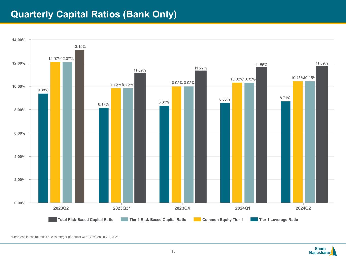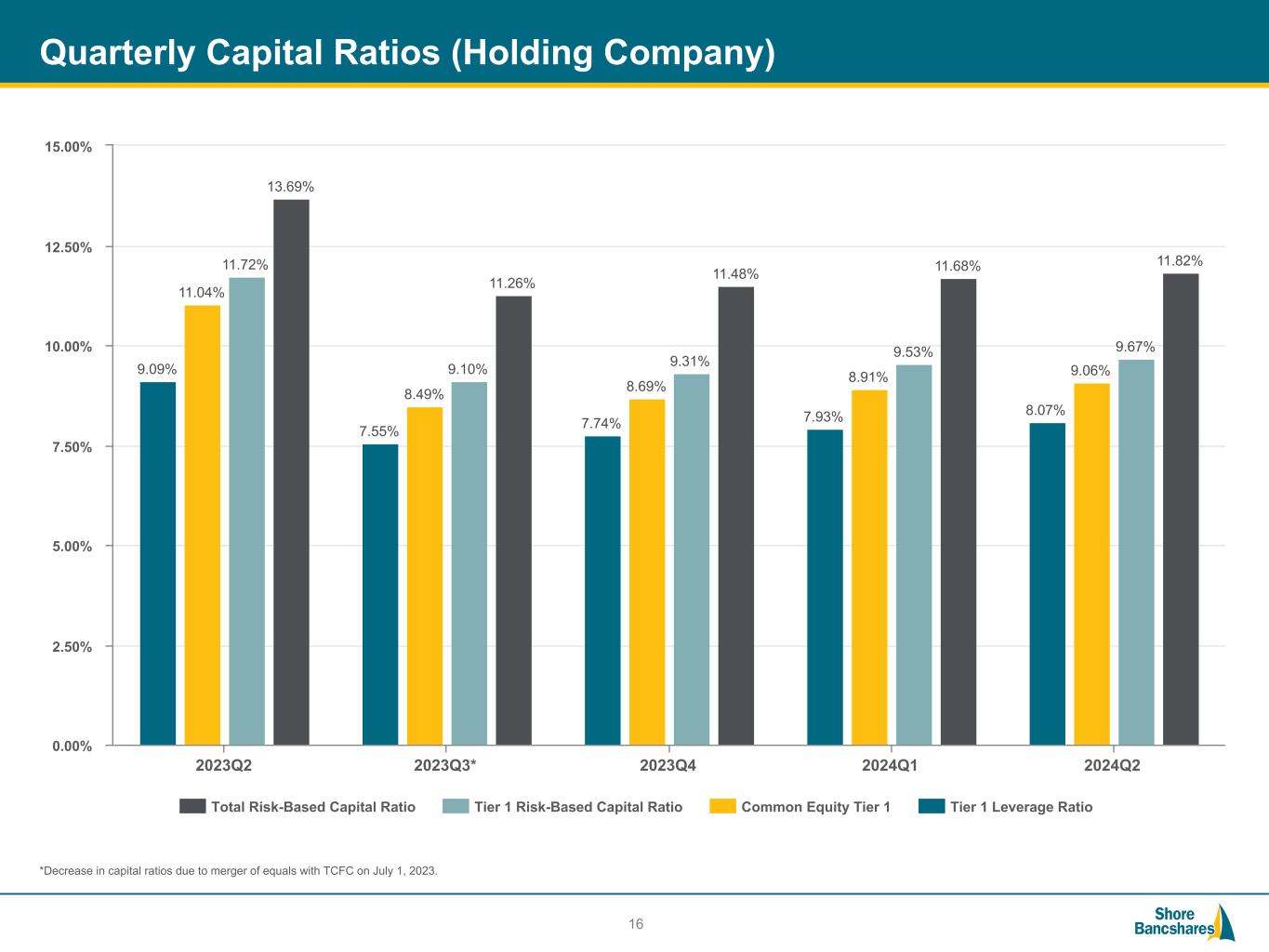 #006881 #ACC0C6 #83AFB4 #FEBE10 #5F574F #4D4F53 #C75B12 #5B8F22 #593160 Quarterly Capital Ratios (Bank Only) 15 9.38% 8.17% 8.33% 8.58% 8.71% 12.07% 9.85% 10.02% 10.32% 10.45% 12.07% 9.85% 10.02% 10.32% 10.45% 13.15% 11.09% 11.27% 11.56% 11.69% Total Risk-Based Capital Ratio Tier 1 Risk-Based Capital Ratio Common Equity Tier 1 Tier 1 Leverage Ratio 2023Q2 2023Q3* 2023Q4 2024Q1 2024Q2 0.00% 2.00% 4.00% 6.00% 8.00% 10.00% 12.00% 14.00% *Decrease in capital ratios due to merger of equals with TCFC on July 1, 2023.