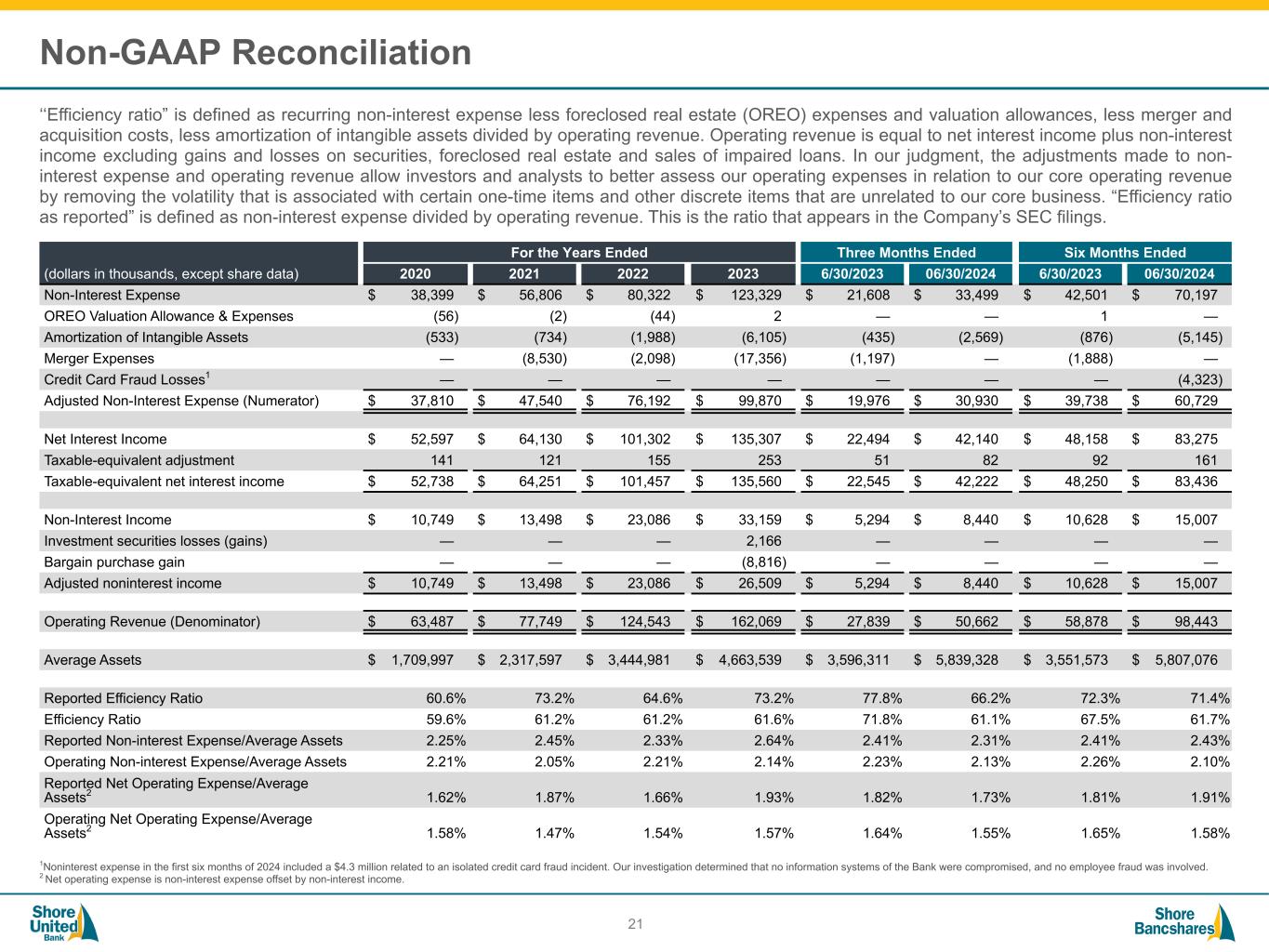 #006881 #ACC0C6 #83AFB4 #FEBE10 #5F574F #4D4F53 #C75B12 #5B8F22 #593160 Non-GAAP Reconciliation ‘‘Tangible book value per share’’ is defined as tangible stockholders’ equity less preferred equity and intangible assets divided by total common shares outstanding. We believe that this measure is important to many investors in the marketplace who are interested in changes from period to period in book value per common share exclusive of changes in intangible assets. 20 (dollars in thousands, except share data) For the Years Ended 2003 2004 2005 2006 2007 2008 2009 2010 2011 2012 2013 Stockholders' Equity $ 83,527 $ 92,976 $ 101,448 $ 111,327 $ 120,235 $ 127,385 $ 127,810 $ 122,513 $ 121,249 $ 114,026 $ 103,299 Intangible Assets 7,571 14,181 13,845 13,508 22,390 21,875 21,360 18,518 16,662 16,270 15,974 Preferred Equity — — — — — — — — — — — Tangible Common Equity $ 75,956 $ 78,795 $ 87,603 $ 97,819 $ 97,845 $ 105,510 $ 106,450 $ 103,995 $ 104,587 $ 97,756 $ 87,325 Shares Outstanding 8,101,190 8,272,797 8,335,478 8,383,395 8,380,530 8,404,684 8,418,963 8,443,436 8,457,359 8,457,359 8,471,289 Tangible Book Value per Share $ 9.37 $ 9.53 $ 10.51 $ 11.67 $ 11.68 $ 12.55 $ 12.64 $ 12.32 $ 12.37 $ 11.56 $ 10.31 (dollars in thousands, except share data) For the Years Ended YTD 2014 2015 2016 2017 2018 2019 2020 2021 2022 2023 06/30/2024 Stockholders' Equity $ 140,469 $ 146,967 $ 154,299 $ 163,736 $ 183,185 $ 192,802 $ 195,019 $ 350,693 $ 364,285 $ 511,135 $ 522,783 Intangible Assets 13,262 13,142 13,010 21,241 20,375 19,770 19,237 70,956 68,813 111,356 106,211 Preferred Equity — — — — — — — — — — — Tangible Common Equity $ 127,207 $ 133,825 $ 141,289 $ 142,495 $ 162,810 $ 173,032 $ 175,782 $ 279,737 $ 295,472 $ 399,779 $ 416,572 Total Assets $ 1,100,402 $ 1,135,143 $ 1,160,271 $ 1,393,860 $ 1,483,076 $ 1,559,235 $ 1,933,315 $ 3,460,136 $ 3,477,276 $ 6,010,918 $ 5,864,017 Intangible Assets 13,262 13,142 13,010 21,241 20,375 19,770 19,237 70,956 68,813 111,356 106,211 Tangible Assets $ 1,087,140 $ 1,122,001 $ 1,147,261 $ 1,372,619 $ 1,462,701 $ 1,539,465 $ 1,914,078 $ 3,389,180 $ 3,408,463 $ 5,899,562 $ 5,757,806 Shares Outstanding 12,618,513 12,631,160 12,664,797 12,688,224 12,749,497 12,500,372 11,783,380 19,807,533 19,864,956 33,161,532 33,214,522 Tangible Book Value per Share $ 10.08 $ 10.59 $ 11.16 $ 11.23 $ 12.77 $ 13.84 $ 14.92 $ 14.12 $ 14.87 $ 12.06 $ 12.54 GAAP Book Value $ 11.13 $ 11.64 $ 12.18 $ 12.90 $ 14.37 $ 15.42 $ 16.55 $ 17.71 $ 18.34 $ 15.41 $ 15.74