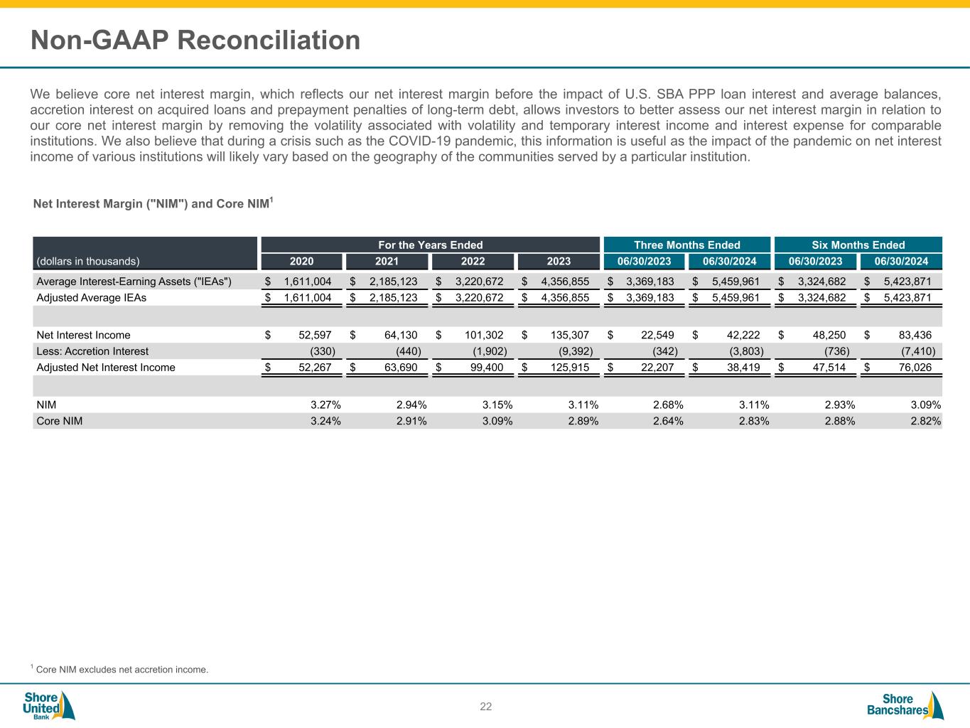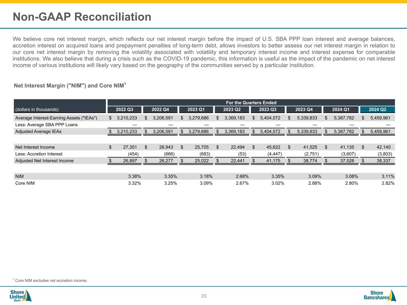 #006881 #ACC0C6 #83AFB4 #FEBE10 #5F574F #4D4F53 #C75B12 #5B8F22 #593160 Non-GAAP Reconciliation We believe core net interest margin, which reflects our net interest margin before the impact of U.S. SBA PPP loan interest and average balances, accretion interest on acquired loans and prepayment penalties of long-term debt, allows investors to better assess our net interest margin in relation to our core net interest margin by removing the volatility associated with volatility and temporary interest income and interest expense for comparable institutions. We also believe that during a crisis such as the COVID-19 pandemic, this information is useful as the impact of the pandemic on net interest income of various institutions will likely vary based on the geography of the communities served by a particular institution. 22 Net Interest Margin ("NIM") and Core NIM1 (dollars in thousands) For the Years Ended Three Months Ended Six Months Ended 2020 2021 2022 2023 06/30/2023 06/30/2024 06/30/2023 06/30/2024 Average Interest-Earning Assets ("IEAs") $ 1,611,004 $ 2,185,123 $ 3,220,672 $ 4,356,855 $ 3,369,183 $ 5,459,961 $ 3,324,682 $ 5,423,871 Adjusted Average IEAs $ 1,611,004 $ 2,185,123 $ 3,220,672 $ 4,356,855 $ 3,369,183 $ 5,459,961 $ 3,324,682 $ 5,423,871 Net Interest Income $ 52,597 $ 64,130 $ 101,302 $ 135,307 $ 22,549 $ 42,222 $ 48,250 $ 83,436 Less: Accretion Interest (330) (440) (1,902) (9,392) (342) (3,803) (736) (7,410) Adjusted Net Interest Income $ 52,267 $ 63,690 $ 99,400 $ 125,915 $ 22,207 $ 38,419 $ 47,514 $ 76,026 NIM 3.27 % 2.94 % 3.15 % 3.11 % 2.68 % 3.11 % 2.93 % 3.09 % Core NIM 3.24 % 2.91 % 3.09 % 2.89 % 2.64 % 2.83 % 2.88 % 2.82 % 1 Core NIM excludes net accretion income.