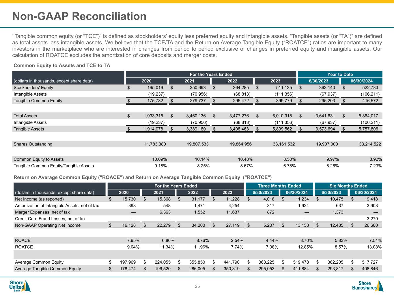 #006881 #ACC0C6 #83AFB4 #FEBE10 #5F574F #4D4F53 #C75B12 #5B8F22 #593160 Non-GAAP Reconciliation During 2023, our operating results were impacted by one-time expenses related to the merger equal with The Community Financial Corporation ("TCFC"). We believe that investors would benefit from analyzing our profitability and expense metrics excluding this one-time item. 24 (dollars in thousands, except share data) For the Years Ended Three Months Ended Six Months Ended 2020 2021 2022 2023 6/30/2023 06/30/2024 6/30/2023 06/30/2024 Net Income (as reported) $ 15,730 $ 15,368 $ 31,177 $ 11,228 $ 4,018 $ 11,234 $ 10,475 $ 19,418 Amortization of Intangible Assets, net of tax 398 533 1,471 4,254 317 1,924 637 3,903 Merger Expenses, net of tax — 6,189 1,552 11,637 872 — 1,373 — Credit Card Fraud Losses, net of tax — — — — — — — 3,279 Non-GAAP Operating Net Income $ 16,128 $ 22,090 $ 34,200 $ 27,119 $ 5,207 $ 13,158 $ 12,485 $ 26,600 Reported Return on Average Assets 0.92 % 0.66 % 0.90 % 0.24 % 0.45 % 0.77 % 0.59 % 0.67 % Operating Return on Average Assets 0.94 % 0.95 % 0.99 % 0.58 % 0.58 % 0.91 % 0.71 % 0.92 % Reported Return on Average Common Equity 7.95 % 6.86 % 8.76 % 2.54 % 4.44 % 8.70 % 5.83 % 7.54 % Operating Return on Average Common Equity 9.04 % 11.24 % 11.96 % 7.74 % 7.08 % 12.85 % 8.57 % 13.08 % Reported Diluted Earnings Per Share $ 1.27 $ 1.17 $ 1.57 $ 0.42 $ 0.20 $ 0.34 $ 0.53 $ 0.58 Operating Diluted Earnings Per Share $ 1.30 $ 1.68 $ 1.72 $ 1.02 $ 0.26 $ 0.40 $ 0.63 $ 0.80 Average Assets $ 1,709,997 $ 2,317,597 $ 3,444,981 $ 4,663,539 $ 3,596,311 $ 5,839,328 $ 3,551,573 $ 5,807,076 Average Equity $ 197,969 $ 224,055 $ 355,850 $ 441,790 $ 363,225 $ 519,478 $ 362,205 $ 517,727 Average Goodwill and Core Deposit Intangible (19,498) (27,535) (69,845) (91,471) (68,172) (107,594) (68,388) (108,881) Average Tangible Equity $ 178,471 $ 196,520 $ 286,005 $ 350,319 $ 295,053 $ 411,884 $ 293,817 $ 408,846 Weighted Average Common Shares Outstanding 12,380,000 13,119,000 19,847,000 26,572,000 19,903,000 33,215,000 19,895,000 33,337,000