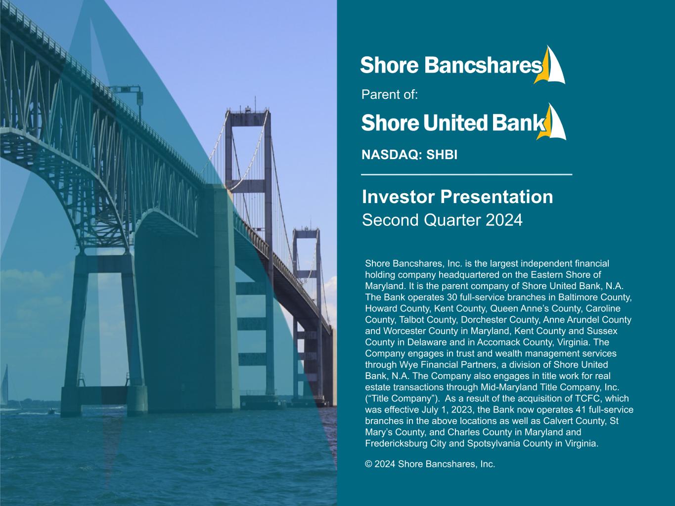 #006881 #ACC0C6 #83AFB4 #FEBE10 #5F574F #4D4F53 #C75B12 #5B8F22 #593160 Investor Presentation Second Quarter 2024 NASDAQ: SHBI Parent of: Shore Bancshares, Inc. is the largest independent financial holding company headquartered on the Eastern Shore of Maryland. It is the parent company of Shore United Bank, N.A. The Bank operates 30 full-service branches in Baltimore County, Howard County, Kent County, Queen Anne’s County, Caroline County, Talbot County, Dorchester County, Anne Arundel County and Worcester County in Maryland, Kent County and Sussex County in Delaware and in Accomack County, Virginia. The Company engages in trust and wealth management services through Wye Financial Partners, a division of Shore United Bank, N.A. The Company also engages in title work for real estate transactions through Mid-Maryland Title Company, Inc. (“Title Company”). As a result of the acquisition of TCFC, which was effective July 1, 2023, the Bank now operates 41 full-service branches in the above locations as well as Calvert County, St Mary’s County, and Charles County in Maryland and Fredericksburg City and Spotsylvania County in Virginia. © 2024 Shore Bancshares, Inc.
