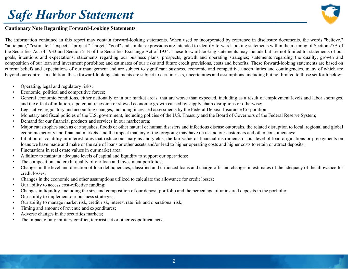 Safe Harbor Statement Cautionary Note Regarding Forward-Looking Statements The information contained in this report may contain forward-looking statements. When used or incorporated by reference in disclosure documents, the words "believe," "anticipate," "estimate," "expect," "project," "target," "goal" and similar expressions are intended to identify forward-looking statements within the meaning of Section 27A of the Securities Act of 1933 and Section 21E of the Securities Exchange Act of 1934. These forward-looking statements may include but are not limited to: statements of our goals, intentions and expectations; statements regarding our business plans, prospects, growth and operating strategies; statements regarding the quality, growth and composition of our loan and investment portfolios; and estimates of our risks and future credit provisions, costs and benefits. These forward-looking statements are based on current beliefs and expectations of our management and are subject to significant business, economic and competitive uncertainties and contingencies, many of which are beyond our control. In addition, these forward-looking statements are subject to certain risks, uncertainties and assumptions, including but not limited to those set forth below: • Operating, legal and regulatory risks; • Economic, political and competitive forces; • General economic conditions, either nationally or in our market areas, that are worse than expected, including as a result of employment levels and labor shortages, and the effect of inflation, a potential recession or slowed economic growth caused by supply chain disruptions or otherwise; • Legislative, regulatory and accounting changes, including increased assessments by the Federal Deposit Insurance Corporation; • Monetary and fiscal policies of the U.S. government, including policies of the U.S. Treasury and the Board of Governors of the Federal Reserve System; • Demand for our financial products and services in our market area; • Major catastrophes such as earthquakes, floods or other natural or human disasters and infectious disease outbreaks, the related disruption to local, regional and global economic activity and financial markets, and the impact that any of the foregoing may have on us and our customers and other constituencies; • Inflation or volatility in interest rates that reduce our margins and yields, the fair value of financial instruments or our level of loan originations or prepayments on loans we have made and make or the sale of loans or other assets and/or lead to higher operating costs and higher costs to retain or attract deposits; • Fluctuations in real estate values in our market area; • A failure to maintain adequate levels of capital and liquidity to support our operations; • The composition and credit quality of our loan and investment portfolios; • Changes in the level and direction of loan delinquencies, classified and criticized loans and charge-offs and changes in estimates of the adequacy of the allowance for credit losses; • Changes in the economic and other assumptions utilized to calculate the allowance for credit losses; • Our ability to access cost-effective funding; • Changes in liquidity, including the size and composition of our deposit portfolio and the percentage of uninsured deposits in the portfolio; • Our ability to implement our business strategies; • Our ability to manage market risk, credit risk, interest rate risk and operational risk; • Timing and amount of revenue and expenditures; • Adverse changes in the securities markets; • The impact of any military conflict, terrorist act or other geopolitical acts; 2