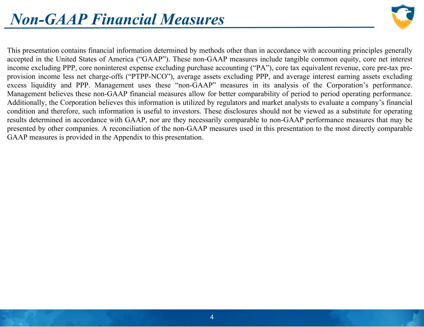 Non-GAAP Financial Measures This presentation contains financial information determined by methods other than in accordance with accounting principles generally accepted in the United States of America (“GAAP”). These non-GAAP measures include tangible common equity, core net interest income excluding PPP, core noninterest expense excluding purchase accounting (“PA”), core tax equivalent revenue, core pre-tax pre- provision income less net charge-offs (“PTPP-NCO”), average assets excluding PPP, and average interest earning assets excluding excess liquidity and PPP. Management uses these “non-GAAP” measures in its analysis of the Corporation’s performance. Management believes these non-GAAP financial measures allow for better comparability of period to period operating performance. Additionally, the Corporation believes this information is utilized by regulators and market analysts to evaluate a company’s financial condition and therefore, such information is useful to investors. These disclosures should not be viewed as a substitute for operating results determined in accordance with GAAP, nor are they necessarily comparable to non-GAAP performance measures that may be presented by other companies. A reconciliation of the non-GAAP measures used in this presentation to the most directly comparable GAAP measures is provided in the Appendix to this presentation. 4