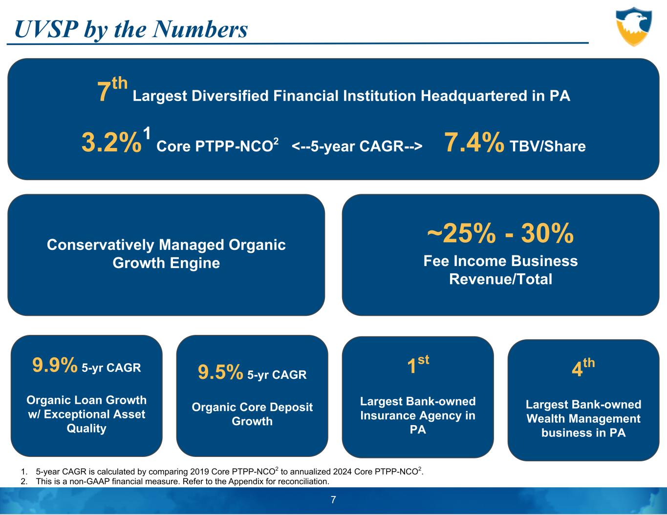 Univest Company Overview • Headquartered in Souderton, Pennsylvania (Montgomery County) • Bank founded in 1876, holding company formed in 1973 • Engaged in financial services business, providing full range of banking, insurance and wealth management services ◦ Comprehensive financial solutions delivered locally • Experienced management team with proven performance track record • Primarily serving thirteen counties in the Southeastern and Central regions of Pennsylvania, six counties in Western Pennsylvania, three counties in Southern New Jersey and four counties in Maryland • Operating leverage and scale with $7.9 billion of assets, $5.0 billion of assets under management and supervision and agent for $218 million of underwritten insurance premiums as of 6/30/24 6