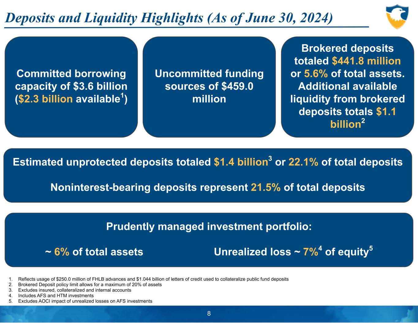 Deposits and Liquidity Highlights (As of June 30, 2024) 8 Committed borrowing capacity of $3.6 billion ($2.3 billion available1) Estimated unprotected deposits totaled $1.4 billion3 or 22.1% of total deposits Noninterest-bearing deposits represent 21.5% of total deposits Prudently managed investment portfolio: ~ 6% of total assets Unrealized loss ~ 7%4 of equity5 Brokered deposits totaled $441.8 million or 5.6% of total assets. Additional available liquidity from brokered deposits totals $1.1 billion2 Uncommitted funding sources of $459.0 million 1. Reflects usage of $250.0 million of FHLB advances and $1.044 billion of letters of credit used to collateralize public fund deposits 2. Brokered Deposit policy limit allows for a maximum of 20% of assets 3. Excludes insured, collateralized and internal accounts 4. Includes AFS and HTM investments 5. Excludes AOCI impact of unrealized losses on AFS investments