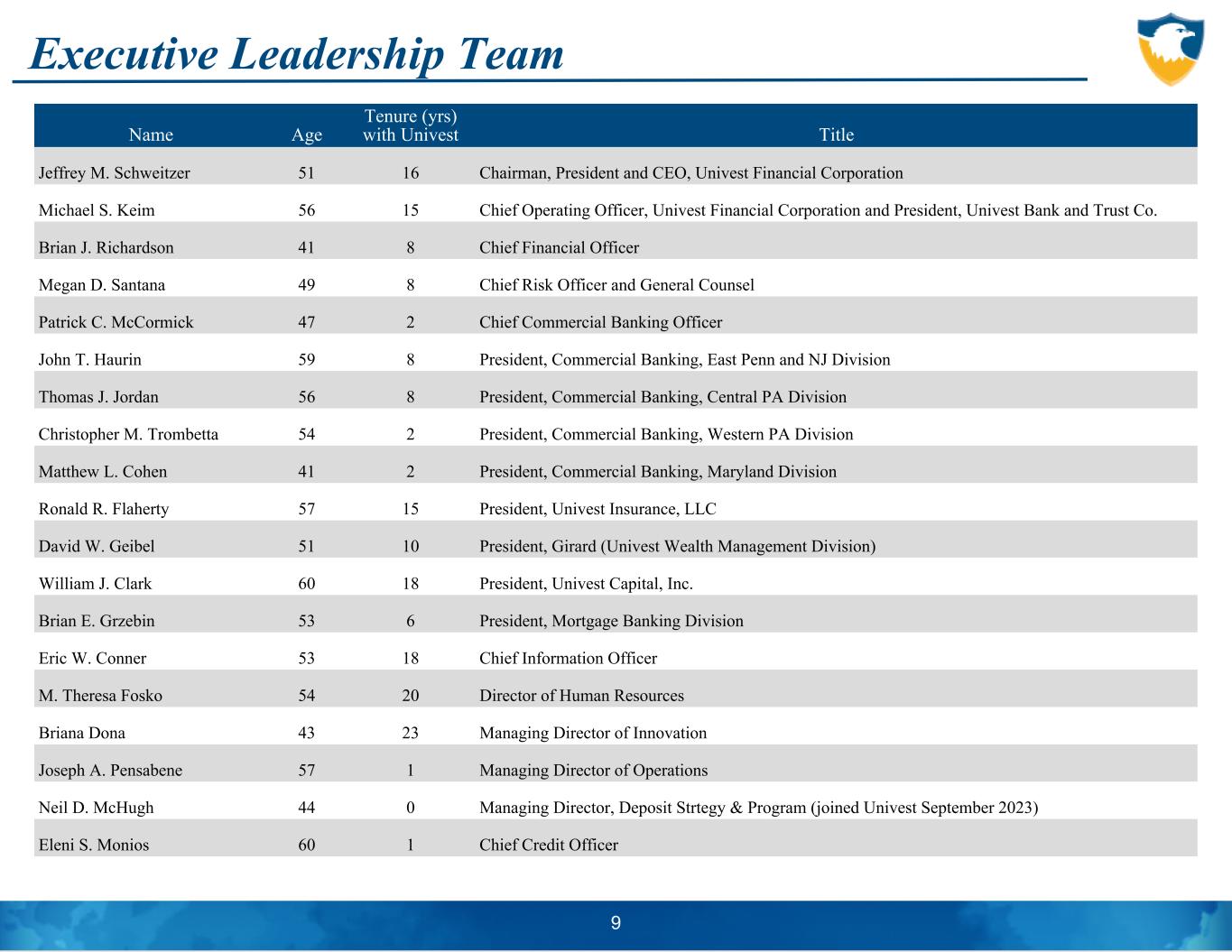 Executive Leadership Team 9 Name Age Tenure (yrs) with Univest Title Jeffrey M. Schweitzer 51 16 Chairman, President and CEO, Univest Financial Corporation Michael S. Keim 56 15 Chief Operating Officer, Univest Financial Corporation and President, Univest Bank and Trust Co. Brian J. Richardson 41 8 Chief Financial Officer Megan D. Santana 49 8 Chief Risk Officer and General Counsel Patrick C. McCormick 47 2 Chief Commercial Banking Officer John T. Haurin 59 8 President, Commercial Banking, East Penn and NJ Division Thomas J. Jordan 56 8 President, Commercial Banking, Central PA Division Christopher M. Trombetta 54 2 President, Commercial Banking, Western PA Division Matthew L. Cohen 41 2 President, Commercial Banking, Maryland Division Ronald R. Flaherty 57 15 President, Univest Insurance, LLC David W. Geibel 51 10 President, Girard (Univest Wealth Management Division) William J. Clark 60 18 President, Univest Capital, Inc. Brian E. Grzebin 53 6 President, Mortgage Banking Division Eric W. Conner 53 18 Chief Information Officer M. Theresa Fosko 54 20 Director of Human Resources Briana Dona 43 23 Managing Director of Innovation Joseph A. Pensabene 57 1 Managing Director of Operations Neil D. McHugh 44 0 Managing Director, Deposit Strtegy & Program (joined Univest September 2023) Eleni S. Monios 60 1 Chief Credit Officer 9