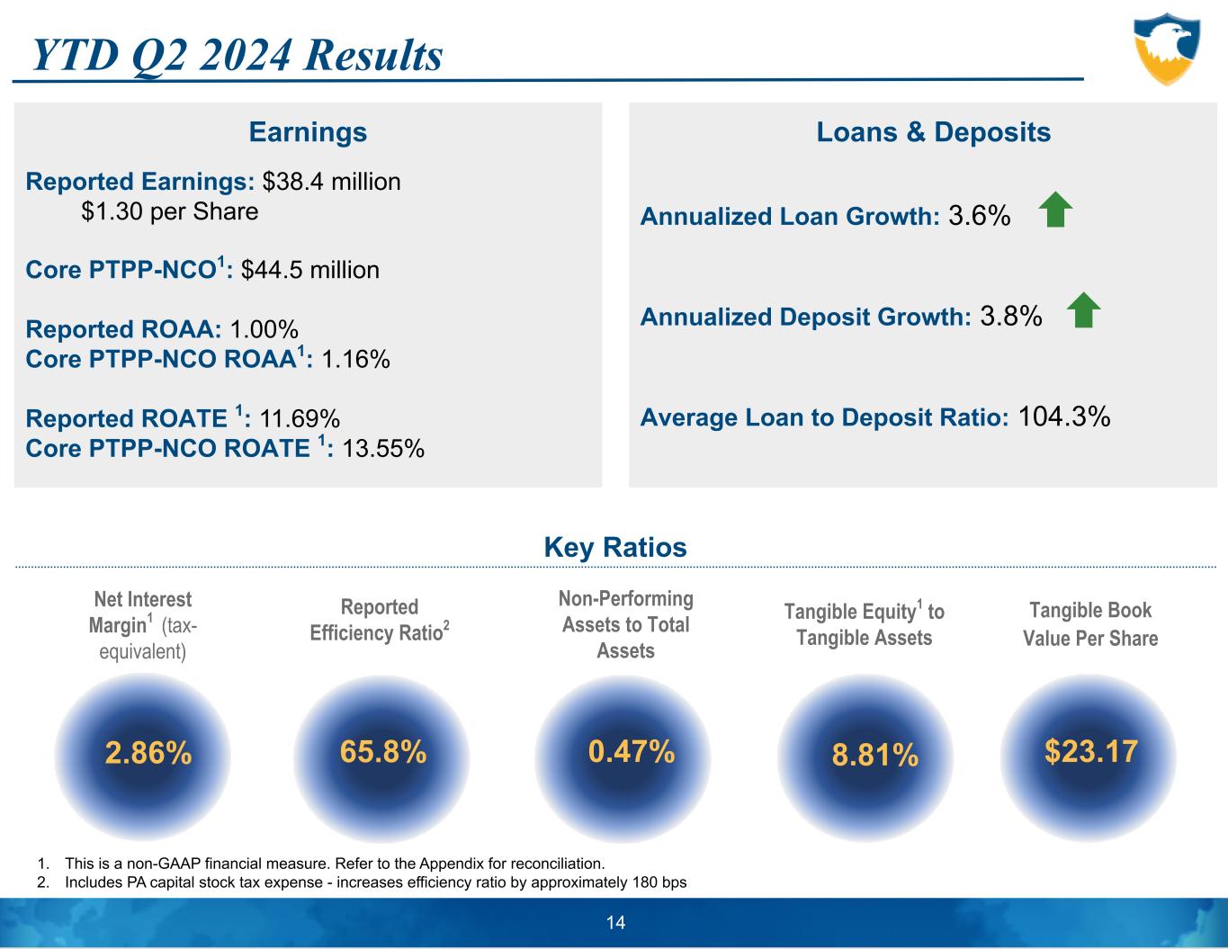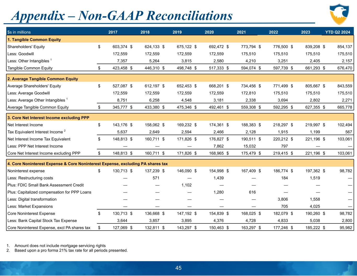 Appendix – Non-GAAP Reconciliations 1. Amount does not include mortgage servicing rights 2. Based upon a pro forma 21% tax rate for all periods presented. $s in millions 2017 2018 2019 2020 2021 2022 2023 YTD Q2 2024 1. Tangible Common Equity Shareholders' Equity $ 603,374 $ 624,133 $ 675,122 $ 692,472 $ 773,794 $ 776,500 $ 839,208 $ 854,137 Less: Goodwill 172,559 172,559 172,559 172,559 175,510 175,510 175,510 175,510 Less: Other Intangibles 1 7,357 5,264 3,815 2,580 4,210 3,251 2,405 2,157 Tangible Common Equity $ 423,458 $ 446,310 $ 498,748 $ 517,333 $ 594,074 $ 597,739 $ 661,293 $ 676,470 2. Average Tangible Common Equity Average Shareholders' Equity $ 527,087 $ 612,197 $ 652,453 $ 668,201 $ 734,456 $ 771,499 $ 805,667 $ 843,559 Less: Average Goodwill 172,559 172,559 172,559 172,559 172,810 175,510 175,510 175,510 Less: Average Other Intangibles 1 8,751 6,258 4,548 3,181 2,338 3,694 2,802 2,271 Average Tangible Common Equity $ 345,777 $ 433,380 $ 475,346 $ 492,461 $ 559,308 $ 592,295 $ 627,355 $ 665,778 3. Core Net Interest Income excluding PPP Net Interest Income $ 143,176 $ 158,062 $ 169,232 $ 174,361 $ 188,383 $ 218,297 $ 219,997 $ 102,494 Tax Equivalent Interest Income 2 5,637 2,649 2,594 2,466 2,128 1,915 1,199 567 Net Interest Income Tax Equivalent $ 148,813 $ 160,711 $ 171,826 $ 176,827 $ 190,511 $ 220,212 $ 221,196 $ 103,061 Less: PPP Net Interest Income — — — 7,862 15,032 797 — — Core Net Interest Income excluding PPP $ 148,813 $ 160,711 $ 171,826 $ 168,965 $ 175,479 $ 219,415 $ 221,196 $ 103,061 4. Core Noninterest Expense & Core Noninterest Expense, excluding PA shares tax Noninterest expense $ 130,713 $ 137,239 $ 146,090 $ 154,998 $ 167,409 $ 186,774 $ 197,362 $ 98,782 Less: Restructuring costs — 571 — 1,439 — 184 1,519 — Plus: FDIC Small Bank Assessment Credit — — 1,102 — — — — — Plus: Capitalized compensation for PPP Loans — — — 1,280 616 — — — Less: Digital transformation — — — — — 3,806 1,558 — Less: Market Expansions — — — — — 705 4,025 — Core Noninterest Expense $ 130,713 $ 136,668 $ 147,192 $ 154,839 $ 168,025 $ 182,079 $ 190,260 $ 98,782 Less: Bank Capital Stock Tax Expense 3,644 3,857 3,895 4,376 4,728 4,833 5,038 2,800 Core Noninterest Expense, excl PA shares tax $ 127,069 $ 132,811 $ 143,297 $ 150,463 $ 163,297 $ 177,246 $ 185,222 $ 95,982 45