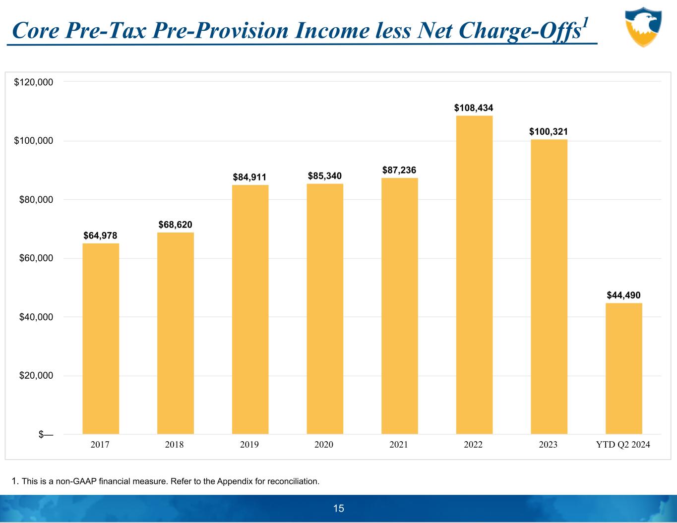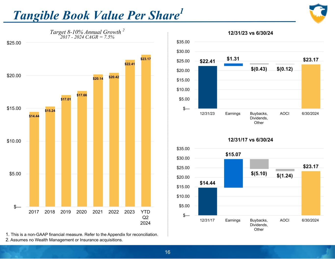 $64,978 $68,620 $84,911 $85,340 $87,236 $108,434 $100,321 $44,490 2017 2018 2019 2020 2021 2022 2023 YTD Q2 2024 $— $20,000 $40,000 $60,000 $80,000 $100,000 $120,000 Core Pre-Tax Pre-Provision Income less Net Charge-Offs1 1. This is a non-GAAP financial measure. Refer to the Appendix for reconciliation. 15