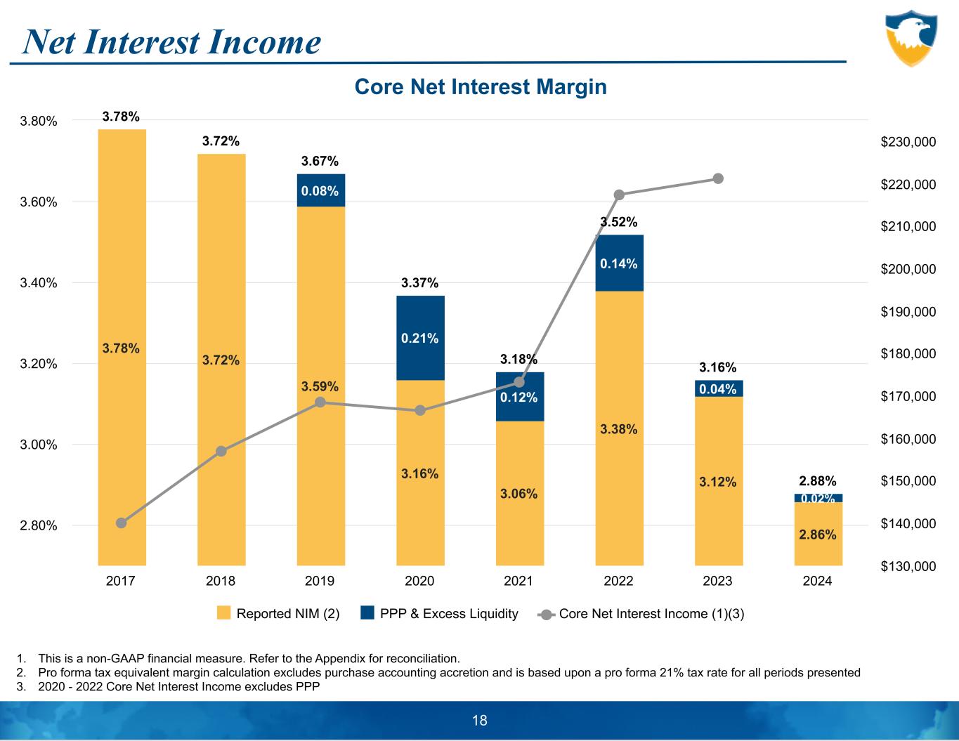 Core PTPP- NCO ROAA & ROTE 1. This is a non-GAAP financial measure. Refer to the Appendix for reconciliation. 1.49% 1.45% 1.63% 1.51% 1.37% 1.56% 1.33% 1.16% 2017 2018 2019 2020 2021 2022 2023 YTD Q2 2024 1.00% 1.10% 1.20% 1.30% 1.40% 1.50% 1.60% 1.70% 1.80% 1.90% 2.00% 19.54% 16.33% 18.20% 17.58% 15.77% 18.53% 16.14% 13.55% 2017 2018 2019 2020 2021 2022 2023 YTD Q2 2024 12.00% 13.00% 14.00% 15.00% 16.00% 17.00% 18.00% 19.00% 20.00% 21.00% 22.00% 17 Core PTPP-NCO ROAA1 Core PTPP-NCO ROTE1