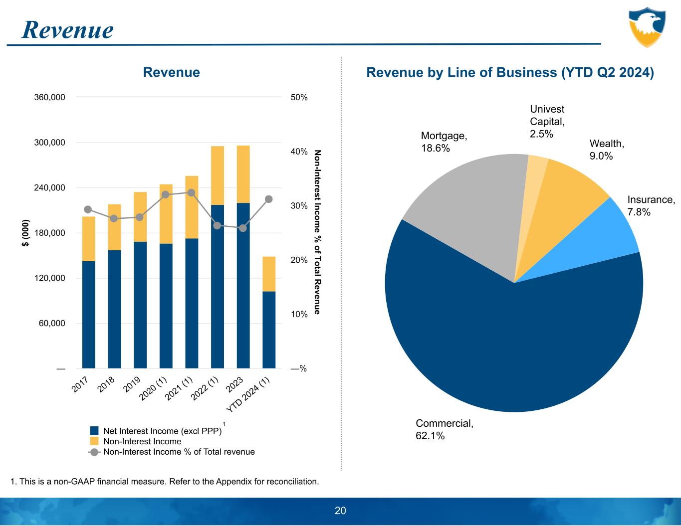 62.5% 61.9% 61.4% 60.6% 60.9% 62.4% 66.0% 65.8% 60.8% 60.1% 60.2% 60.7% 63.2% 59.7% 62.0% 65.5% Reported Efficiency Ratio (Noninterest Expense/Tax Equivalent Revenue) Efficiency Ratio (Core Noninterest Expense Excluding PA Shares Tax/Core Tax Equivalent Revenue) (1),(2) 2017 2018 2019 2020 2021 2022 2023 Q2 2024 50.0% 52.5% 55.0% 57.5% 60.0% 62.5% 65.0% 67.5% 70.0% 72.5% 75.0% Efficiency Ratio 1. This is a non-GAAP financial measure. Refer to the Appendix for reconciliation. 2. Based upon a pro forma 21% tax rate for all periods presented. UVSP’s effective tax rate would be approximately 400 bps higher if the Bank Shares Tax was included in income tax expense. 19 UVSP pays a Bank Share Tax rather than Bank Income Tax to the Commonwealth of Pennsylvania as a result of our type of charter. This amount is included in noninterest expense and increases our efficiency ratio by approximately 180 bps compared to other banks that do not have this tax. UVSP’s effective tax rate would be approximately 400 bps higher if the Bank Shares Tax was included in income tax expense.