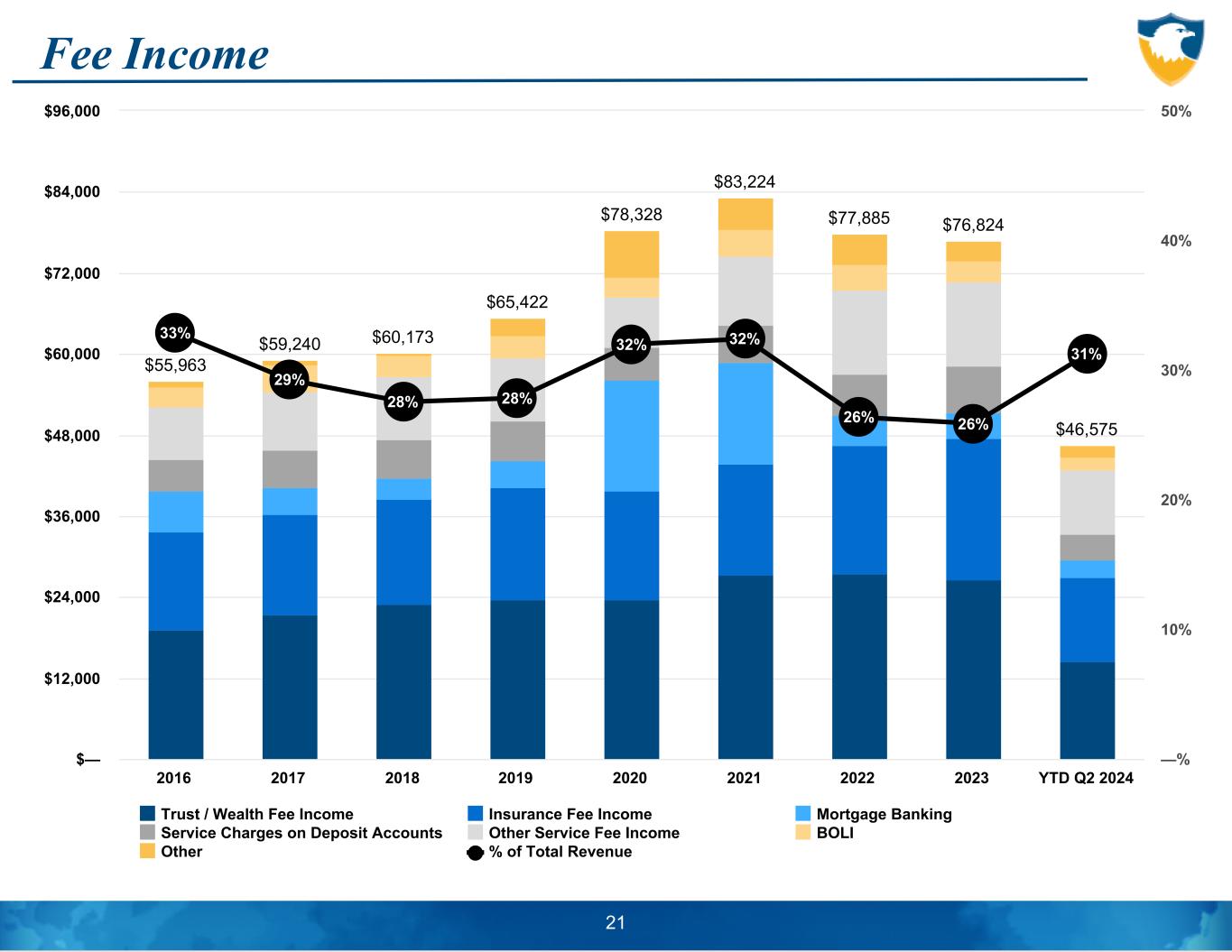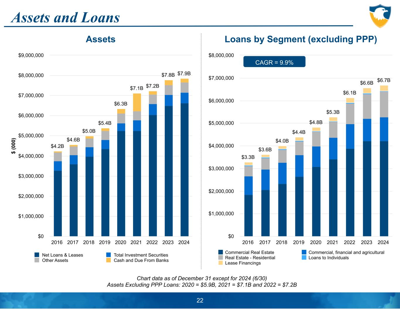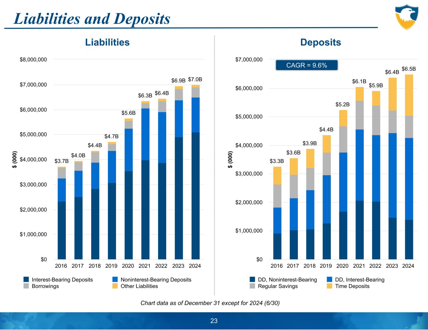 Liabilities and Deposits Chart data as of December 31 except for 2024 (6/30) $ (0 00 ) $3.7B $4.0B $4.4B $4.7B $5.6B $6.3B $6.4B $6.9B $7.0B Interest-Bearing Deposits Noninterest-Bearing Deposits Borrowings Other Liabilities 2016 2017 2018 2019 2020 2021 2022 2023 2024 $0 $1,000,000 $2,000,000 $3,000,000 $4,000,000 $5,000,000 $6,000,000 $7,000,000 $8,000,000 $ (0 00 ) $3.3B $3.6B $3.9B $4.4B $5.2B $6.1B $5.9B $6.4B $6.5B DD, Noninterest-Bearing DD, Interest-Bearing Regular Savings Time Deposits 2016 2017 2018 2019 2020 2021 2022 2023 2024 $0 $1,000,000 $2,000,000 $3,000,000 $4,000,000 $5,000,000 $6,000,000 $7,000,000 23 CAGR = 9.6% Liabilities Deposits