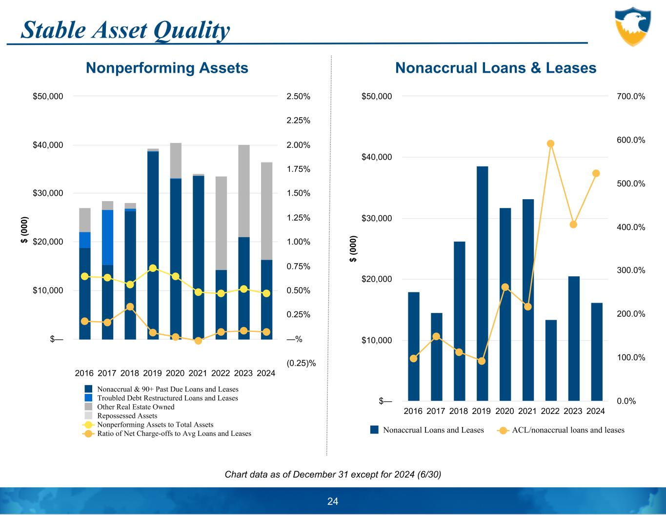 Stable Asset Quality Chart data as of December 31 except for 2024 (6/30) $ (0 00 ) Nonaccrual Loans and Leases ACL/nonaccrual loans and leases 2016 2017 2018 2019 2020 2021 2022 2023 2024 $— $10,000 $20,000 $30,000 $40,000 $50,000 0.0% 100.0% 200.0% 300.0% 400.0% 500.0% 600.0% 700.0% $ (0 00 ) Nonaccrual & 90+ Past Due Loans and Leases Troubled Debt Restructured Loans and Leases Other Real Estate Owned Repossessed Assets Nonperforming Assets to Total Assets Ratio of Net Charge-offs to Avg Loans and Leases 2016 2017 2018 2019 2020 2021 2022 2023 2024 $— $10,000 $20,000 $30,000 $40,000 $50,000 (0.25)% —% 0.25% 0.50% 0.75% 1.00% 1.25% 1.50% 1.75% 2.00% 2.25% 2.50% 24 Nonperforming Assets Nonaccrual Loans & Leases