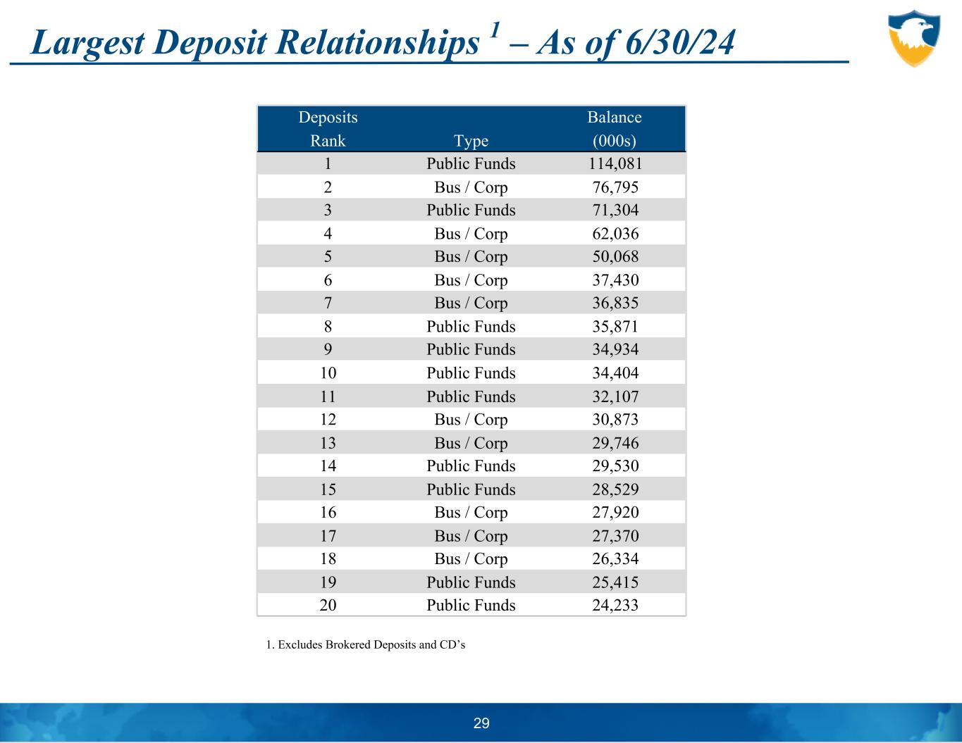 Largest Deposit Relationships 1 – As of 6/30/24 29 Deposits Balance Rank Type (000s) 1 Public Funds 114,081 2 Bus / Corp 76,795 3 Public Funds 71,304 4 Bus / Corp 62,036 5 Bus / Corp 50,068 6 Bus / Corp 37,430 7 Bus / Corp 36,835 8 Public Funds 35,871 9 Public Funds 34,934 10 Public Funds 34,404 11 Public Funds 32,107 12 Bus / Corp 30,873 13 Bus / Corp 29,746 14 Public Funds 29,530 15 Public Funds 28,529 16 Bus / Corp 27,920 17 Bus / Corp 27,370 18 Bus / Corp 26,334 19 Public Funds 25,415 20 Public Funds 24,233 1. Excludes Brokered Deposits and CD’s