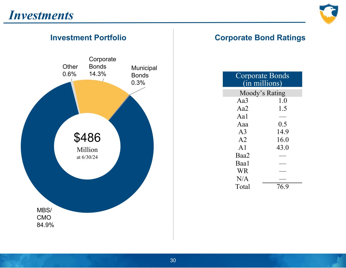 Investments Corporate Bonds (in millions) Moody’s Rating Aa3 1.0 Aa2 1.5 Aa1 — Aaa 0.5 A3 14.9 A2 16.0 A1 43.0 Baa2 — Baa1 — WR — N/A — Total 76.9 30 MBS/ CMO 84.9% Other 0.6% Corporate Bonds 14.3% Municipal Bonds 0.3% $486 Million at 6/30/24 Investment Portfolio Corporate Bond Ratings