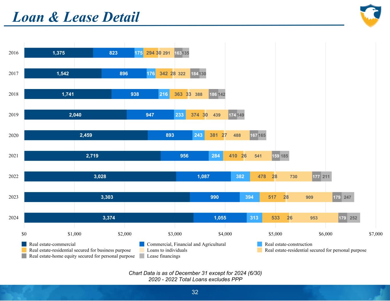Loan & Lease Detail Chart Data is as of December 31 except for 2024 (6/30) 2020 - 2022 Total Loans excludes PPP 32 1,375 1,542 1,741 2,040 2,459 2,719 3,028 3,303 3,374 823 896 938 947 893 956 1,087 990 1,055 175 176 216 233 243 284 382 394 313 294 342 363 374 381 410 478 517 533 30 28 33 30 27 26 28 28 26 291 322 388 439 488 541 730 909 953 163 184 186 174 167 159 177 179 179 135 130 142 149 165 185 211 247 252 Real estate-commercial Commercial, Financial and Agricultural Real estate-construction Real estate-residential secured for business purpose Loans to individuals Real estate-residential secured for personal purpose Real estate-home equity secured for personal purpose Lease financings 2016 2017 2018 2019 2020 2021 2022 2023 2024 $0 $1,000 $2,000 $3,000 $4,000 $5,000 $6,000 $7,000