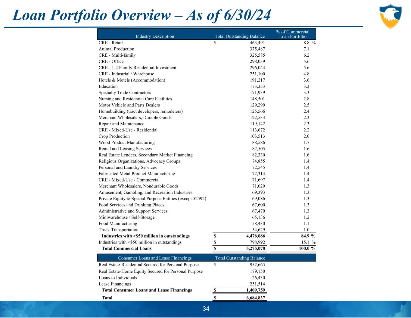Loan Portfolio Overview – As of 6/30/24 34 Industry Description Total Outstanding Balance % of Commercial Loan Portfolio CRE - Retail $ 463,491 8.8 % Animal Production 375,487 7.1 CRE - Multi-family 325,585 6.2 CRE - Office 298,039 5.6 CRE - 1-4 Family Residential Investment 296,044 5.6 CRE - Industrial / Warehouse 251,100 4.8 Hotels & Motels (Accommodation) 191,217 3.6 Education 173,353 3.3 Specialty Trade Contractors 171,939 3.3 Nursing and Residential Care Facilities 148,501 2.8 Motor Vehicle and Parts Dealers 129,299 2.5 Homebuilding (tract developers, remodelers) 125,566 2.4 Merchant Wholesalers, Durable Goods 122,533 2.3 Repair and Maintenance 119,142 2.3 CRE - Mixed-Use - Residential 113,672 2.2 Crop Production 103,513 2.0 Wood Product Manufacturing 88,586 1.7 Rental and Leasing Services 82,505 1.6 Real Estate Lenders, Secondary Market Financing 82,330 1.6 Religious Organizations, Advocacy Groups 74,855 1.4 Personal and Laundry Services 72,545 1.4 Fabricated Metal Product Manufacturing 72,314 1.4 CRE - Mixed-Use - Commercial 71,697 1.4 Merchant Wholesalers, Nondurable Goods 71,029 1.3 Amusement, Gambling, and Recreation Industries 69,393 1.3 Private Equity & Special Purpose Entities (except 52592) 69,086 1.3 Food Services and Drinking Places 67,600 1.3 Administrative and Support Services 67,470 1.3 Miniwarehouse / Self-Storage 65,136 1.2 Food Manufacturing 58,430 1.1 Truck Transportation 54,629 1.0 Industries with >$50 million in outstandings $ 4,476,086 84.9 % Industries with <$50 million in outstandings $ 798,992 15.1 % Total Commercial Loans $ 5,275,078 100.0 % Consumer Loans and Lease Financings Total Outstanding Balance Real Estate-Residential Secured for Personal Purpose $ 952,665 Real Estate-Home Equity Secured for Personal Purpose 179,150 Loans to Individuals 26,430 Lease Financings 251,514 Total Consumer Loans and Lease Financings $ 1,409,759 Total $ 6,684,837