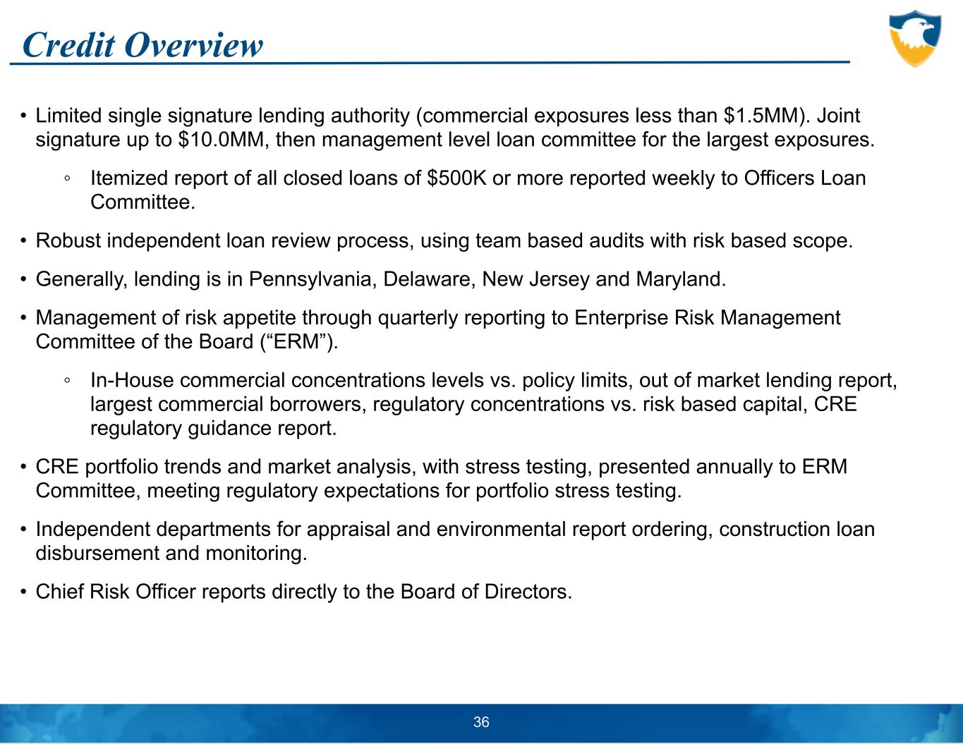 • Limited single signature lending authority (commercial exposures less than $1.5MM). Joint signature up to $10.0MM, then management level loan committee for the largest exposures. ◦ Itemized report of all closed loans of $500K or more reported weekly to Officers Loan Committee. • Robust independent loan review process, using team based audits with risk based scope. • Generally, lending is in Pennsylvania, Delaware, New Jersey and Maryland. • Management of risk appetite through quarterly reporting to Enterprise Risk Management Committee of the Board (“ERM”). ◦ In-House commercial concentrations levels vs. policy limits, out of market lending report, largest commercial borrowers, regulatory concentrations vs. risk based capital, CRE regulatory guidance report. • CRE portfolio trends and market analysis, with stress testing, presented annually to ERM Committee, meeting regulatory expectations for portfolio stress testing. • Independent departments for appraisal and environmental report ordering, construction loan disbursement and monitoring. • Chief Risk Officer reports directly to the Board of Directors. Credit Overview 36