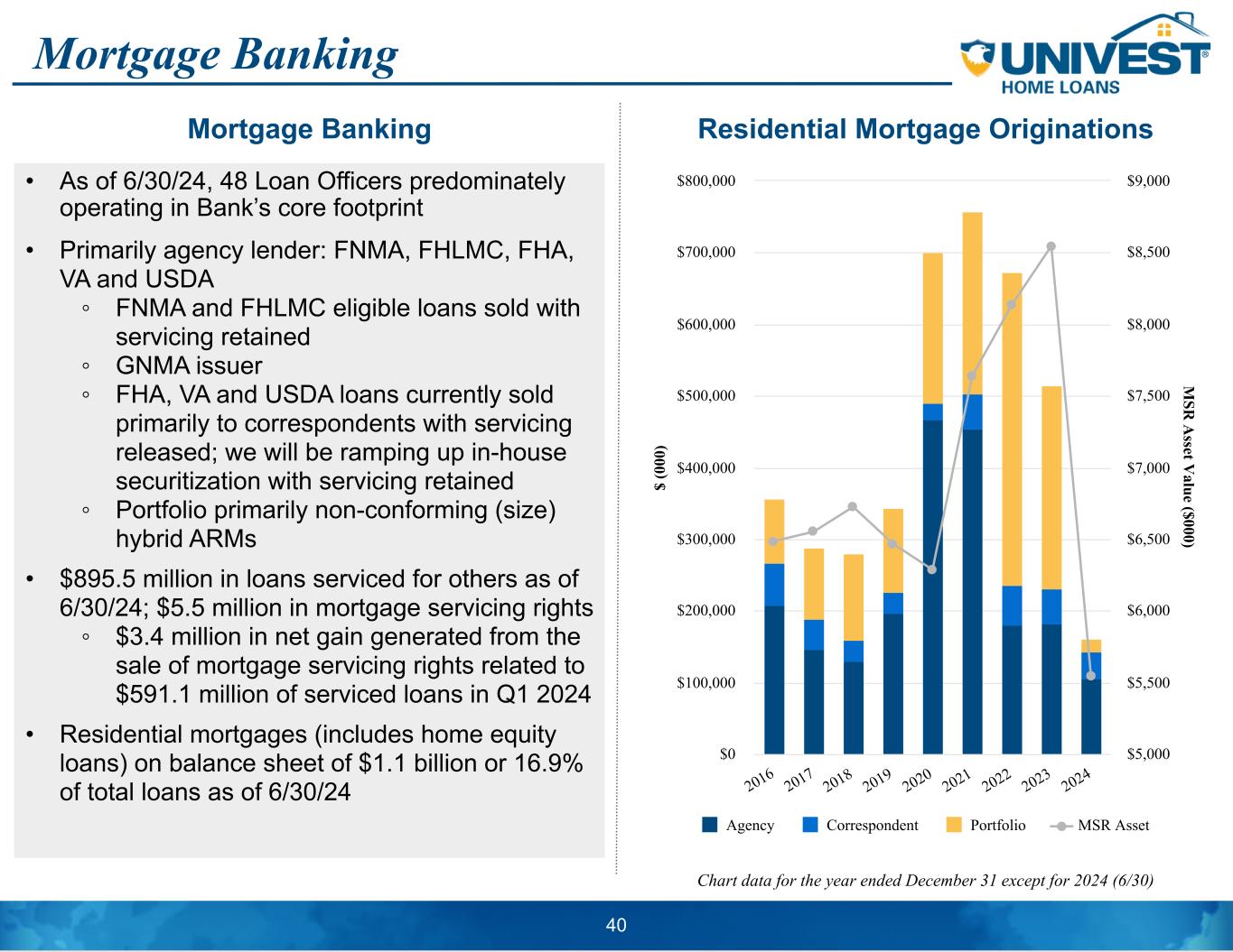 Mortgage Banking • As of 6/30/24, 48 Loan Officers predominately operating in Bank’s core footprint • Primarily agency lender: FNMA, FHLMC, FHA, VA and USDA ◦ FNMA and FHLMC eligible loans sold with servicing retained ◦ GNMA issuer ◦ FHA, VA and USDA loans currently sold primarily to correspondents with servicing released; we will be ramping up in-house securitization with servicing retained ◦ Portfolio primarily non-conforming (size) hybrid ARMs • $895.5 million in loans serviced for others as of 6/30/24; $5.5 million in mortgage servicing rights ◦ $3.4 million in net gain generated from the sale of mortgage servicing rights related to $591.1 million of serviced loans in Q1 2024 • Residential mortgages (includes home equity loans) on balance sheet of $1.1 billion or 16.9% of total loans as of 6/30/24 Chart data for the year ended December 31 except for 2024 (6/30) 40 $ (0 00 ) M SR A sset V alue ($000) Agency Correspondent Portfolio MSR Asset 2016 2017 2018 2019 2020 2021 2022 2023 2024 $0 $100,000 $200,000 $300,000 $400,000 $500,000 $600,000 $700,000 $800,000 $5,000 $5,500 $6,000 $6,500 $7,000 $7,500 $8,000 $8,500 $9,000 Mortgage Banking Residential Mortgage Originations