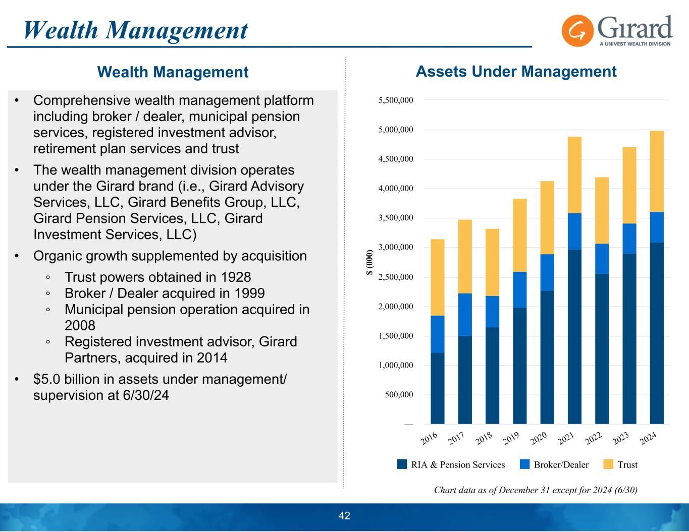Wealth Management • Comprehensive wealth management platform including broker / dealer, municipal pension services, registered investment advisor, retirement plan services and trust • The wealth management division operates under the Girard brand (i.e., Girard Advisory Services, LLC, Girard Benefits Group, LLC, Girard Pension Services, LLC, Girard Investment Services, LLC) • Organic growth supplemented by acquisition ◦ Trust powers obtained in 1928 ◦ Broker / Dealer acquired in 1999 ◦ Municipal pension operation acquired in 2008 ◦ Registered investment advisor, Girard Partners, acquired in 2014 • $5.0 billion in assets under management/ supervision at 6/30/24 Chart data as of December 31 except for 2024 (6/30) $ (0 00 ) RIA & Pension Services Broker/Dealer Trust 2016 2017 2018 2019 2020 2021 2022 2023 2024 — 500,000 1,000,000 1,500,000 2,000,000 2,500,000 3,000,000 3,500,000 4,000,000 4,500,000 5,000,000 5,500,000 42 Wealth Management Assets Under Management