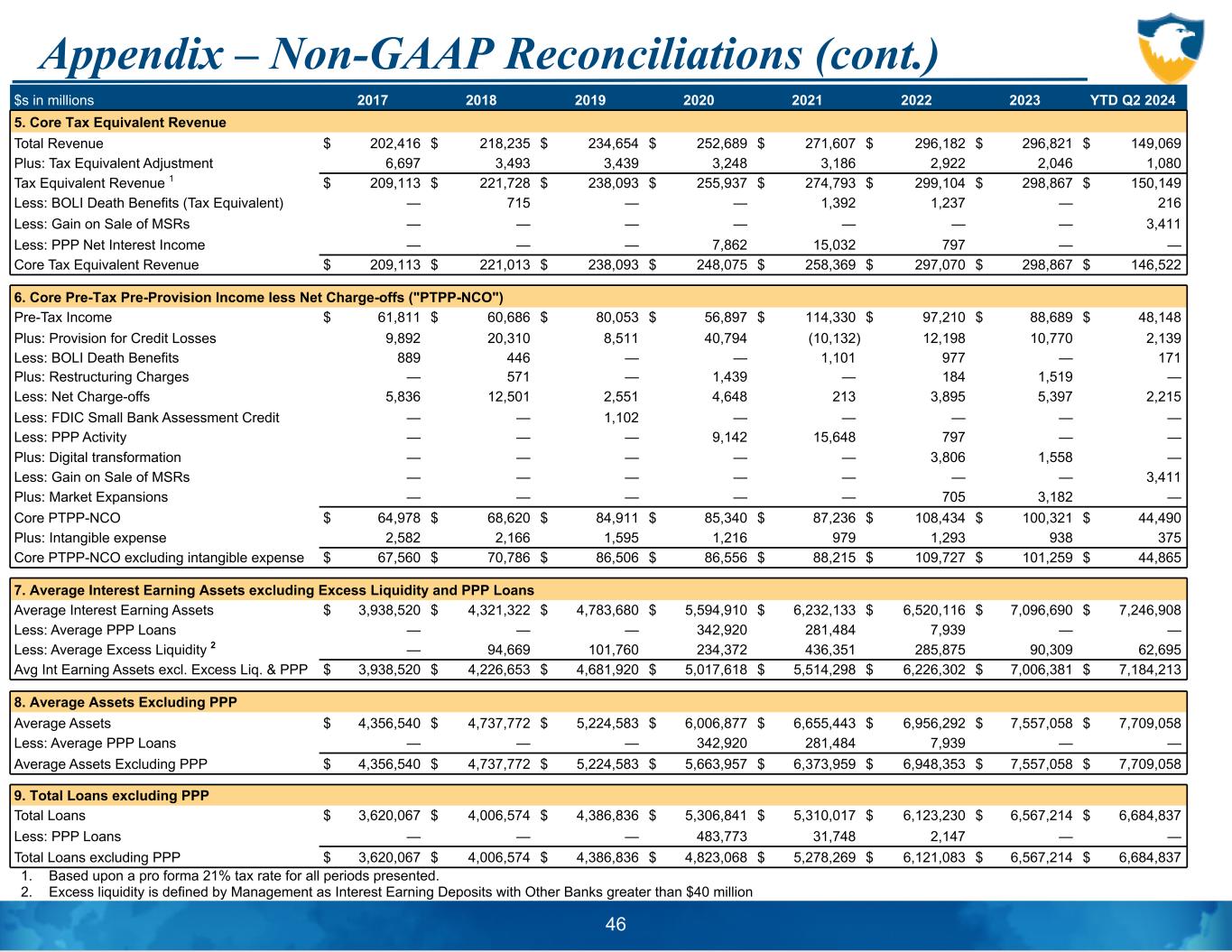 Appendix – Non-GAAP Reconciliations (cont.) 1. Based upon a pro forma 21% tax rate for all periods presented. 2. Excess liquidity is defined by Management as Interest Earning Deposits with Other Banks greater than $40 million 46 $s in millions 2017 2018 2019 2020 2021 2022 2023 YTD Q2 2024 5. Core Tax Equivalent Revenue Total Revenue $ 202,416 $ 218,235 $ 234,654 $ 252,689 $ 271,607 $ 296,182 $ 296,821 $ 149,069 Plus: Tax Equivalent Adjustment 6,697 3,493 3,439 3,248 3,186 2,922 2,046 1,080 Tax Equivalent Revenue 1 $ 209,113 $ 221,728 $ 238,093 $ 255,937 $ 274,793 $ 299,104 $ 298,867 $ 150,149 Less: BOLI Death Benefits (Tax Equivalent) — 715 — — 1,392 1,237 — 216 Less: Gain on Sale of MSRs — — — — — — — 3,411 Less: PPP Net Interest Income — — — 7,862 15,032 797 — — Core Tax Equivalent Revenue $ 209,113 $ 221,013 $ 238,093 $ 248,075 $ 258,369 $ 297,070 $ 298,867 $ 146,522 6. Core Pre-Tax Pre-Provision Income less Net Charge-offs ("PTPP-NCO") Pre-Tax Income $ 61,811 $ 60,686 $ 80,053 $ 56,897 $ 114,330 $ 97,210 $ 88,689 $ 48,148 Plus: Provision for Credit Losses 9,892 20,310 8,511 40,794 (10,132) 12,198 10,770 2,139 Less: BOLI Death Benefits 889 446 — — 1,101 977 — 171 Plus: Restructuring Charges — 571 — 1,439 — 184 1,519 — Less: Net Charge-offs 5,836 12,501 2,551 4,648 213 3,895 5,397 2,215 Less: FDIC Small Bank Assessment Credit — — 1,102 — — — — — Less: PPP Activity — — — 9,142 15,648 797 — — Plus: Digital transformation — — — — — 3,806 1,558 — Less: Gain on Sale of MSRs — — — — — — — 3,411 Plus: Market Expansions — — — — — 705 3,182 — Core PTPP-NCO $ 64,978 $ 68,620 $ 84,911 $ 85,340 $ 87,236 $ 108,434 $ 100,321 $ 44,490 Plus: Intangible expense 2,582 2,166 1,595 1,216 979 1,293 938 375 Core PTPP-NCO excluding intangible expense $ 67,560 $ 70,786 $ 86,506 $ 86,556 $ 88,215 $ 109,727 $ 101,259 $ 44,865 7. Average Interest Earning Assets excluding Excess Liquidity and PPP Loans Average Interest Earning Assets $ 3,938,520 $ 4,321,322 $ 4,783,680 $ 5,594,910 $ 6,232,133 $ 6,520,116 $ 7,096,690 $ 7,246,908 Less: Average PPP Loans — — — 342,920 281,484 7,939 — — Less: Average Excess Liquidity 2 — 94,669 101,760 234,372 436,351 285,875 90,309 62,695 Avg Int Earning Assets excl. Excess Liq. & PPP $ 3,938,520 $ 4,226,653 $ 4,681,920 $ 5,017,618 $ 5,514,298 $ 6,226,302 $ 7,006,381 $ 7,184,213 8. Average Assets Excluding PPP Average Assets $ 4,356,540 $ 4,737,772 $ 5,224,583 $ 6,006,877 $ 6,655,443 $ 6,956,292 $ 7,557,058 $ 7,709,058 Less: Average PPP Loans — — — 342,920 281,484 7,939 — — Average Assets Excluding PPP $ 4,356,540 $ 4,737,772 $ 5,224,583 $ 5,663,957 $ 6,373,959 $ 6,948,353 $ 7,557,058 $ 7,709,058 9. Total Loans excluding PPP Total Loans $ 3,620,067 $ 4,006,574 $ 4,386,836 $ 5,306,841 $ 5,310,017 $ 6,123,230 $ 6,567,214 $ 6,684,837 Less: PPP Loans — — — 483,773 31,748 2,147 — — Total Loans excluding PPP $ 3,620,067 $ 4,006,574 $ 4,386,836 $ 4,823,068 $ 5,278,269 $ 6,121,083 $ 6,567,214 $ 6,684,837