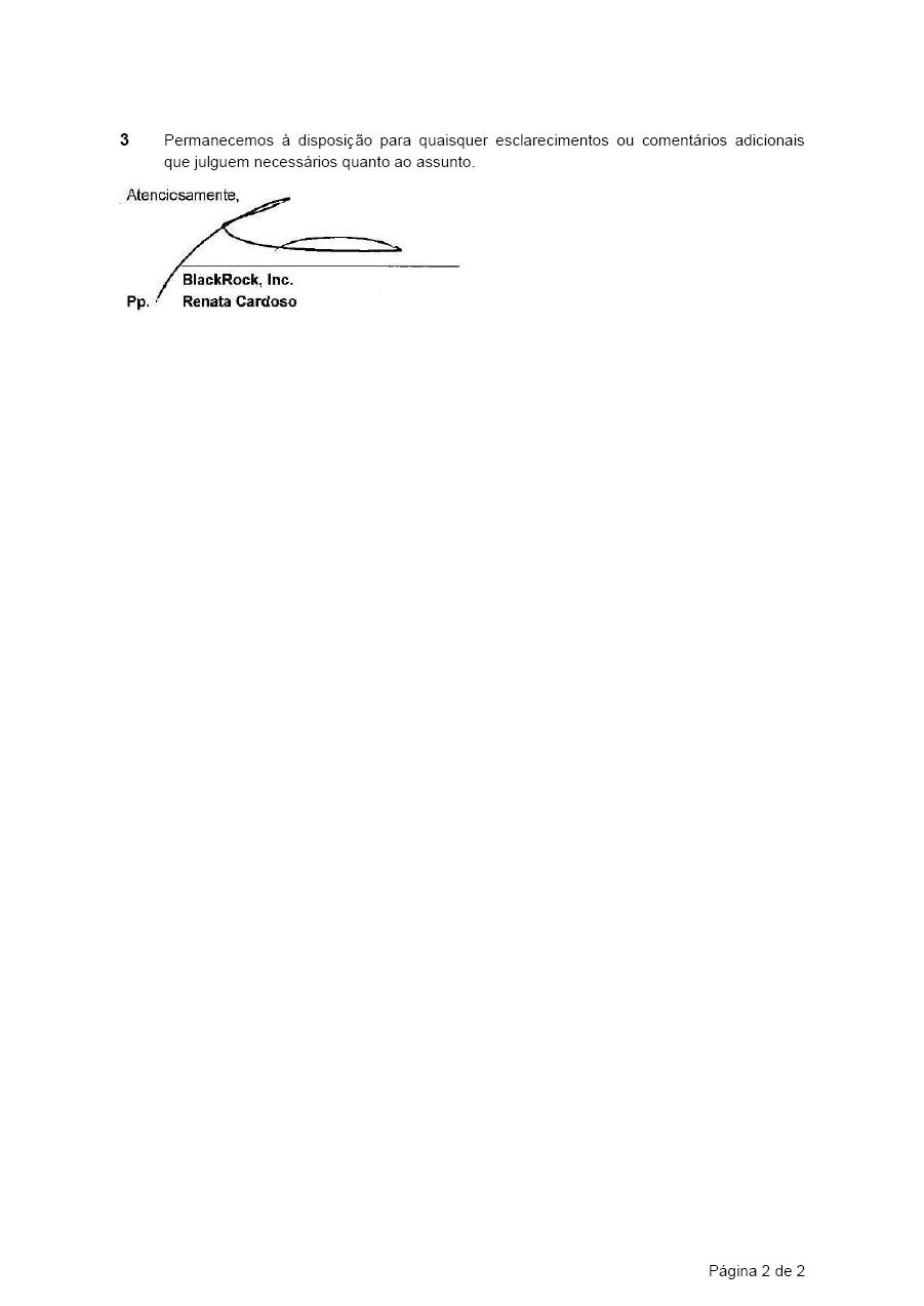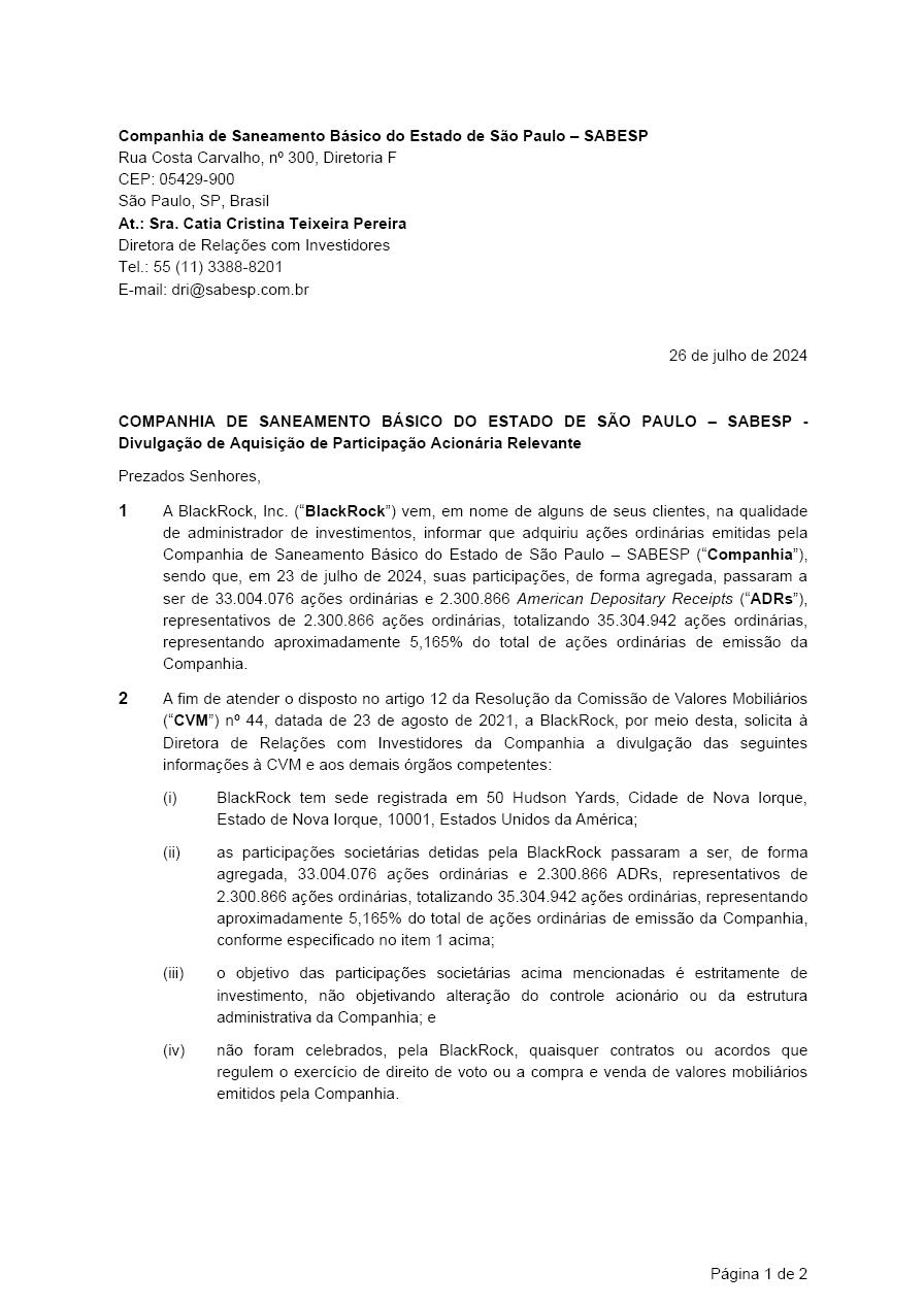 Companhia de Saneamento Básico do Estado de São Paulo - Sabesp (“Company” or “Sabesp”), pursuant to article 12 of CVM Resolution 44/21, hereby informs its shareholders and the market in general that it received today the attached letter from BlackRock, Inc. (“BlackRock”), informing that, in its capacity of a third-party asset manager, it acquired common shares issued by Sabesp and that its holdings, in aggregate, became 33,004,076 common shares and 2,300,866 American Depositary Receipts (“ADRs”), representing 2,300,866 common shares, totaling 35,304,942 common shares, representing approximately 5.165% of the total common shares issued by the Company.