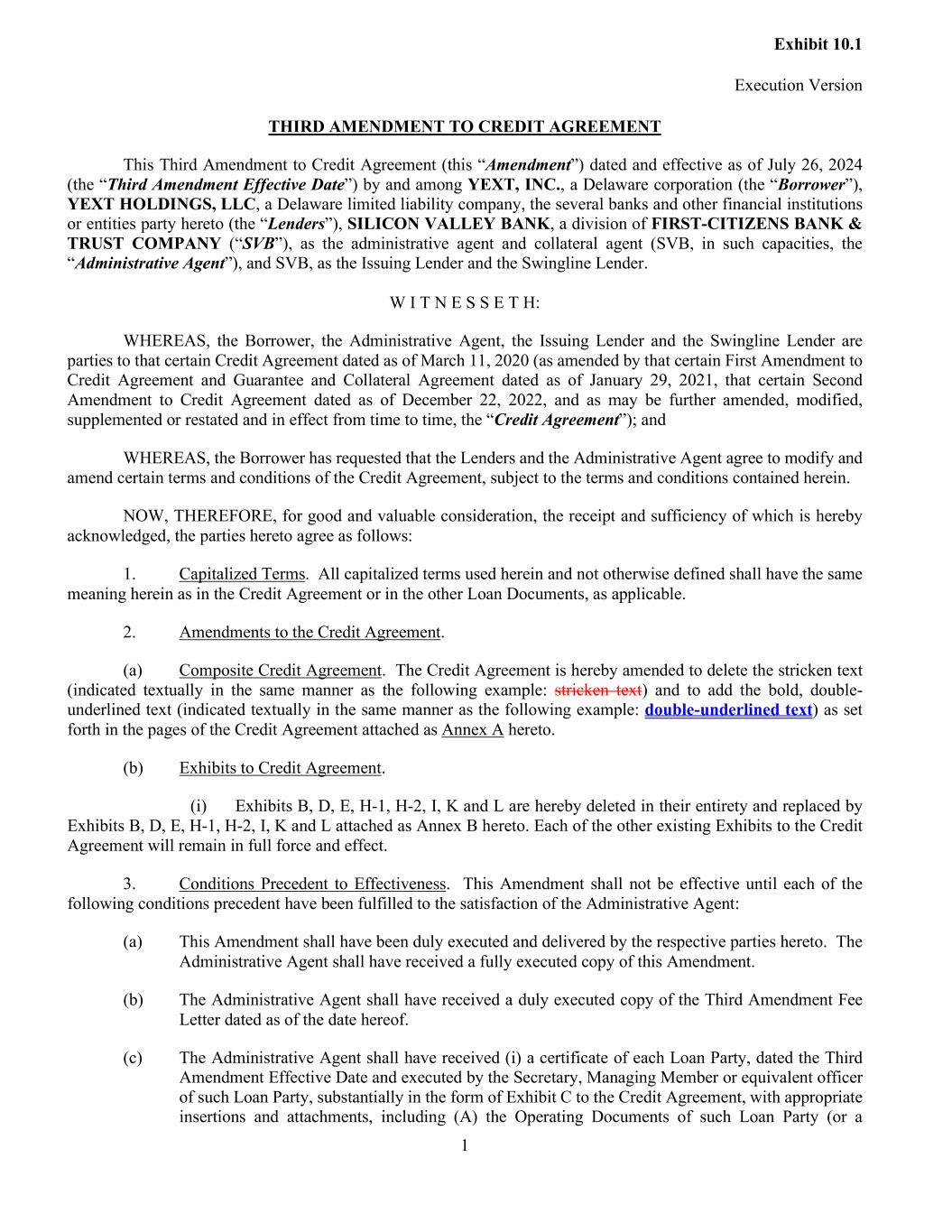 Exhibit 10.1 Execution Version 1 THIRD AMENDMENT TO CREDIT AGREEMENT This Third Amendment to Credit Agreement (this “Amendment”) dated and effective as of July 26, 2024 (the “Third Amendment Effective Date”) by and among YEXT, INC., a Delaware corporation (the “Borrower”), YEXT HOLDINGS, LLC, a Delaware limited liability company, the several banks and other financial institutions or entities party hereto (the “Lenders”), SILICON VALLEY BANK, a division of FIRST-CITIZENS BANK & TRUST COMPANY (“SVB”), as the administrative agent and collateral agent (SVB, in such capacities, the “Administrative Agent”), and SVB, as the Issuing Lender and the Swingline Lender. W I T N E S S E T H: WHEREAS, the Borrower, the Administrative Agent, the Issuing Lender and the Swingline Lender are parties to that certain Credit Agreement dated as of March 11, 2020 (as amended by that certain First Amendment to Credit Agreement and Guarantee and Collateral Agreement dated as of January 29, 2021, that certain Second Amendment to Credit Agreement dated as of December 22, 2022, and as may be further amended, modified, supplemented or restated and in effect from time to time, the “Credit Agreement”); and WHEREAS, the Borrower has requested that the Lenders and the Administrative Agent agree to modify and amend certain terms and conditions of the Credit Agreement, subject to the terms and conditions contained herein. NOW, THEREFORE, for good and valuable consideration, the receipt and sufficiency of which is hereby acknowledged, the parties hereto agree as follows: 1. Capitalized Terms. All capitalized terms used herein and not otherwise defined shall have the same meaning herein as in the Credit Agreement or in the other Loan Documents, as applicable. 2. Amendments to the Credit Agreement. (a) Composite Credit Agreement. The Credit Agreement is hereby amended to delete the stricken text (indicated textually in the same manner as the following example: stricken text) and to add the bold, double- underlined text (indicated textually in the same manner as the following example: double-underlined text) as set forth in the pages of the Credit Agreement attached as Annex A hereto. (b) Exhibits to Credit Agreement. (i) Exhibits B, D, E, H-1, H-2, I, K and L are hereby deleted in their entirety and replaced by Exhibits B, D, E, H-1, H-2, I, K and L attached as Annex B hereto. Each of the other existing Exhibits to the Credit Agreement will remain in full force and effect. 3. Conditions Precedent to Effectiveness. This Amendment shall not be effective until each of the following conditions precedent have been fulfilled to the satisfaction of the Administrative Agent: (a) This Amendment shall have been duly executed and delivered by the respective parties hereto. The Administrative Agent shall have received a fully executed copy of this Amendment. (b) The Administrative Agent shall have received a duly executed copy of the Third Amendment Fee Letter dated as of the date hereof. (c) The Administrative Agent shall have received (i) a certificate of each Loan Party, dated the Third Amendment Effective Date and executed by the Secretary, Managing Member or equivalent officer of such Loan Party, substantially in the form of Exhibit C to the Credit Agreement, with appropriate insertions and attachments, including (A) the Operating Documents of such Loan Party (or a
