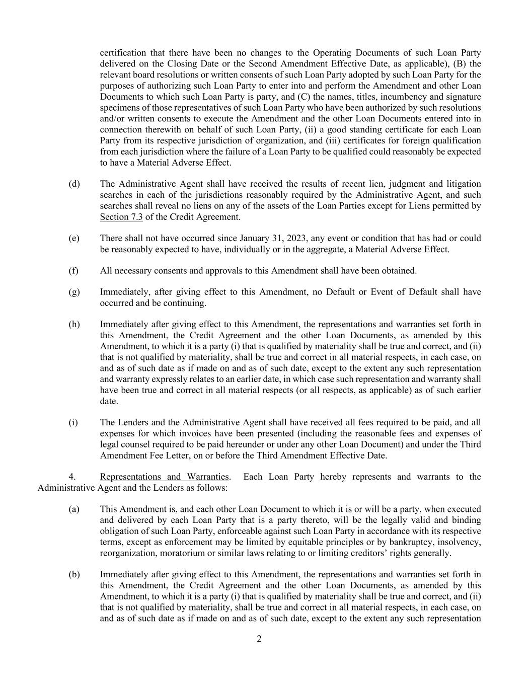 2 certification that there have been no changes to the Operating Documents of such Loan Party delivered on the Closing Date or the Second Amendment Effective Date, as applicable), (B) the relevant board resolutions or written consents of such Loan Party adopted by such Loan Party for the purposes of authorizing such Loan Party to enter into and perform the Amendment and other Loan Documents to which such Loan Party is party, and (C) the names, titles, incumbency and signature specimens of those representatives of such Loan Party who have been authorized by such resolutions and/or written consents to execute the Amendment and the other Loan Documents entered into in connection therewith on behalf of such Loan Party, (ii) a good standing certificate for each Loan Party from its respective jurisdiction of organization, and (iii) certificates for foreign qualification from each jurisdiction where the failure of a Loan Party to be qualified could reasonably be expected to have a Material Adverse Effect. (d) The Administrative Agent shall have received the results of recent lien, judgment and litigation searches in each of the jurisdictions reasonably required by the Administrative Agent, and such searches shall reveal no liens on any of the assets of the Loan Parties except for Liens permitted by Section 7.3 of the Credit Agreement. (e) There shall not have occurred since January 31, 2023, any event or condition that has had or could be reasonably expected to have, individually or in the aggregate, a Material Adverse Effect. (f) All necessary consents and approvals to this Amendment shall have been obtained. (g) Immediately, after giving effect to this Amendment, no Default or Event of Default shall have occurred and be continuing. (h) Immediately after giving effect to this Amendment, the representations and warranties set forth in this Amendment, the Credit Agreement and the other Loan Documents, as amended by this Amendment, to which it is a party (i) that is qualified by materiality shall be true and correct, and (ii) that is not qualified by materiality, shall be true and correct in all material respects, in each case, on and as of such date as if made on and as of such date, except to the extent any such representation and warranty expressly relates to an earlier date, in which case such representation and warranty shall have been true and correct in all material respects (or all respects, as applicable) as of such earlier date. (i) The Lenders and the Administrative Agent shall have received all fees required to be paid, and all expenses for which invoices have been presented (including the reasonable fees and expenses of legal counsel required to be paid hereunder or under any other Loan Document) and under the Third Amendment Fee Letter, on or before the Third Amendment Effective Date. 4. Representations and Warranties. Each Loan Party hereby represents and warrants to the Administrative Agent and the Lenders as follows: (a) This Amendment is, and each other Loan Document to which it is or will be a party, when executed and delivered by each Loan Party that is a party thereto, will be the legally valid and binding obligation of such Loan Party, enforceable against such Loan Party in accordance with its respective terms, except as enforcement may be limited by equitable principles or by bankruptcy, insolvency, reorganization, moratorium or similar laws relating to or limiting creditors’ rights generally. (b) Immediately after giving effect to this Amendment, the representations and warranties set forth in this Amendment, the Credit Agreement and the other Loan Documents, as amended by this Amendment, to which it is a party (i) that is qualified by materiality shall be true and correct, and (ii) that is not qualified by materiality, shall be true and correct in all material respects, in each case, on and as of such date as if made on and as of such date, except to the extent any such representation