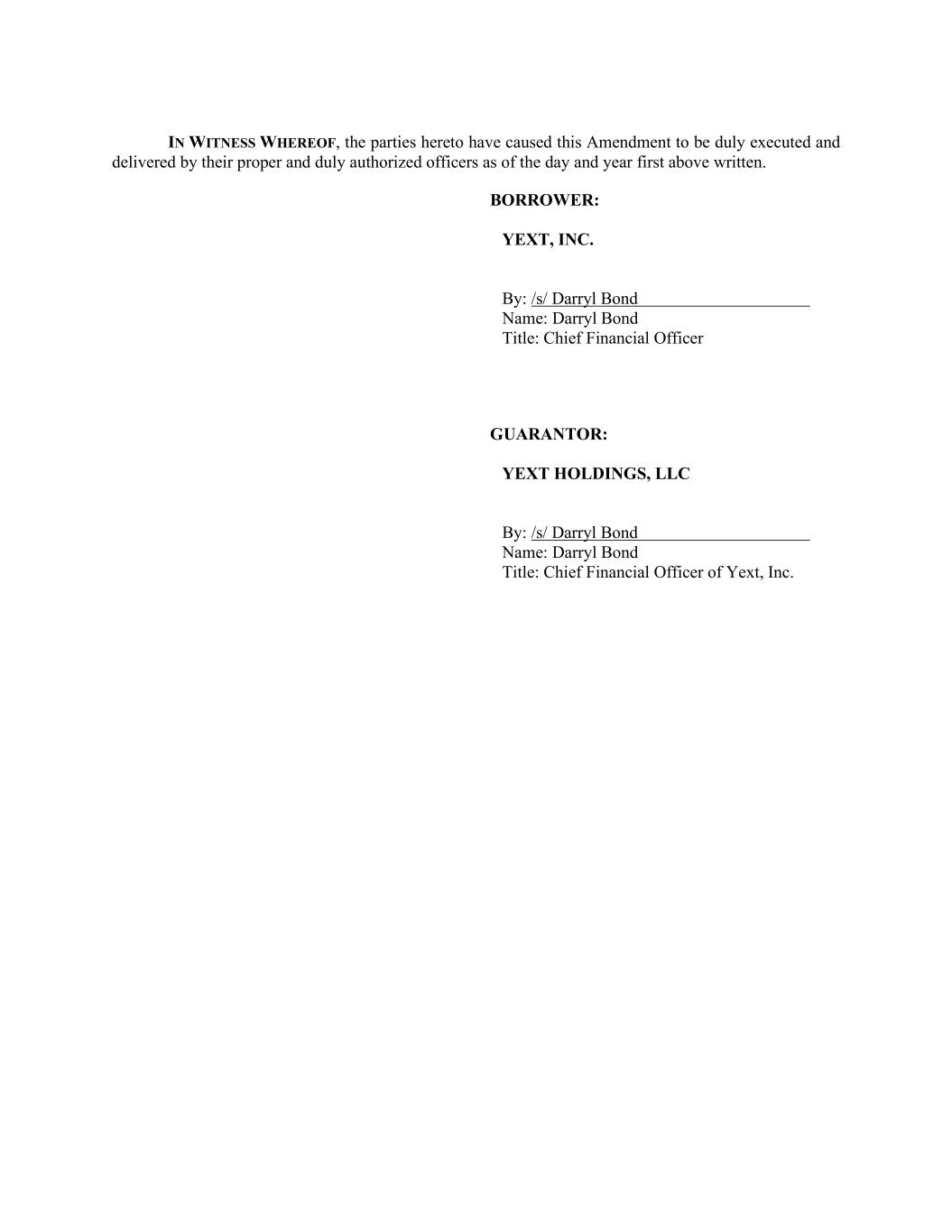 IN WITNESS WHEREOF, the parties hereto have caused this Amendment to be duly executed and delivered by their proper and duly authorized officers as of the day and year first above written. BORROWER: YEXT, INC. By: /s/ Darryl Bond Name: Darryl Bond Title: Chief Financial Officer GUARANTOR: YEXT HOLDINGS, LLC By: /s/ Darryl Bond Name: Darryl Bond Title: Chief Financial Officer of Yext, Inc.