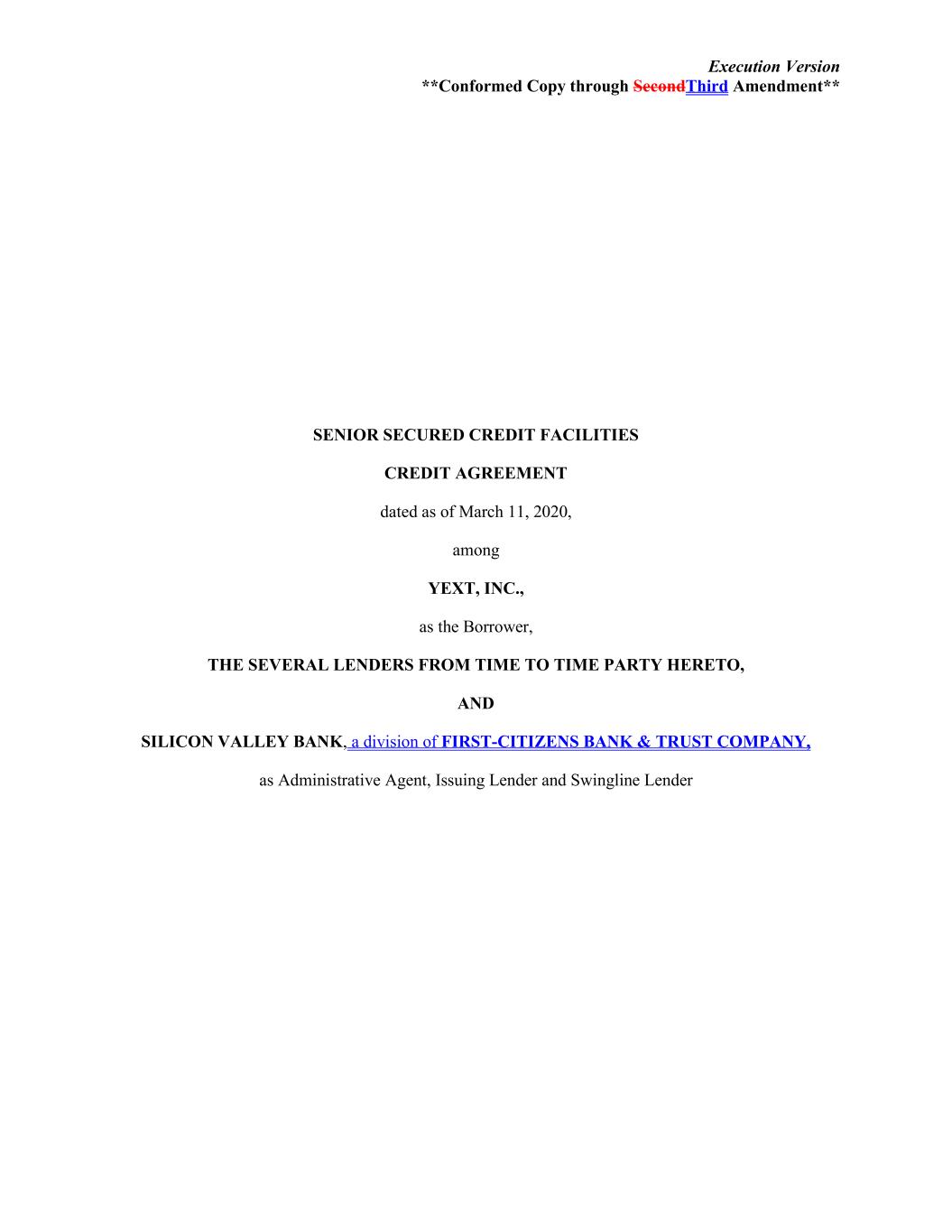 Execution Version **Conformed Copy through SecondThird Amendment** SENIOR SECURED CREDIT FACILITIES CREDIT AGREEMENT dated as of March 11, 2020, among YEXT, INC., as the Borrower, THE SEVERAL LENDERS FROM TIME TO TIME PARTY HERETO, AND SILICON VALLEY BANK, a division of FIRST-CITIZENS BANK & TRUST COMPANY, as Administrative Agent, Issuing Lender and Swingline Lender