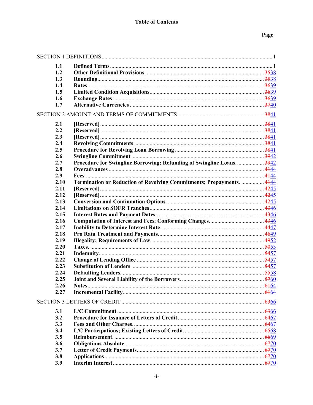 Table of Contents Page -i- SECTION 1 DEFINITIONS ......................................................................................................................... 1 1.1 Defined Terms ................................................................................................................... 1 1.2 Other Definitional Provisions. ................................................................................... 3538 1.3 Rounding...................................................................................................................... 3538 1.4 Rates ............................................................................................................................. 3639 1.5 Limited Condition Acquisitions ................................................................................. 3639 1.6 Exchange Rates ........................................................................................................... 3639 1.7 Alternative Currencies ............................................................................................... 3740 SECTION 2 AMOUNT AND TERMS OF COMMITMENTS ............................................................. 3841 2.1 [Reserved] .................................................................................................................... 3841 2.2 [Reserved] .................................................................................................................... 3841 2.3 [Reserved] .................................................................................................................... 3841 2.4 Revolving Commitments. ........................................................................................... 3841 2.5 Procedure for Revolving Loan Borrowing ............................................................... 3841 2.6 Swingline Commitment .............................................................................................. 3942 2.7 Procedure for Swingline Borrowing; Refunding of Swingline Loans. ................... 3942 2.8 Overadvances .............................................................................................................. 4144 2.9 Fees. .............................................................................................................................. 4144 2.10 Termination or Reduction of Revolving Commitments; Prepayments. ................ 4144 2.11 [Reserved]. ................................................................................................................... 4245 2.12 [Reserved]. ................................................................................................................... 4245 2.13 Conversion and Continuation Options. .................................................................... 4245 2.14 Limitations on SOFR Tranches ................................................................................. 4346 2.15 Interest Rates and Payment Dates. ............................................................................ 4346 2.16 Computation of Interest and Fees; Conforming Changes ....................................... 4346 2.17 Inability to Determine Interest Rate. ........................................................................ 4447 2.18 Pro Rata Treatment and Payments. .......................................................................... 4649 2.19 Illegality; Requirements of Law. ............................................................................... 4952 2.20 Taxes. ........................................................................................................................... 5053 2.21 Indemnity ..................................................................................................................... 5457 2.22 Change of Lending Office .......................................................................................... 5457 2.23 Substitution of Lenders .............................................................................................. 5457 2.24 Defaulting Lenders. .................................................................................................... 5558 2.25 Joint and Several Liability of the Borrowers. .......................................................... 5760 2.26 Notes ............................................................................................................................. 6164 2.27 Incremental Facility. ................................................................................................... 6164 SECTION 3 LETTERS OF CREDIT ..................................................................................................... 6366 3.1 L/C Commitment. ....................................................................................................... 6366 3.2 Procedure for Issuance of Letters of Credit ............................................................. 6467 3.3 Fees and Other Charges. ............................................................................................ 6467 3.4 L/C Participations; Existing Letters of Credit. ........................................................ 6568 3.5 Reimbursement. .......................................................................................................... 6669 3.6 Obligations Absolute ................................................................................................... 6770 3.7 Letter of Credit Payments .......................................................................................... 6770 3.8 Applications ................................................................................................................. 6770 3.9 Interim Interest ........................................................................................................... 6770