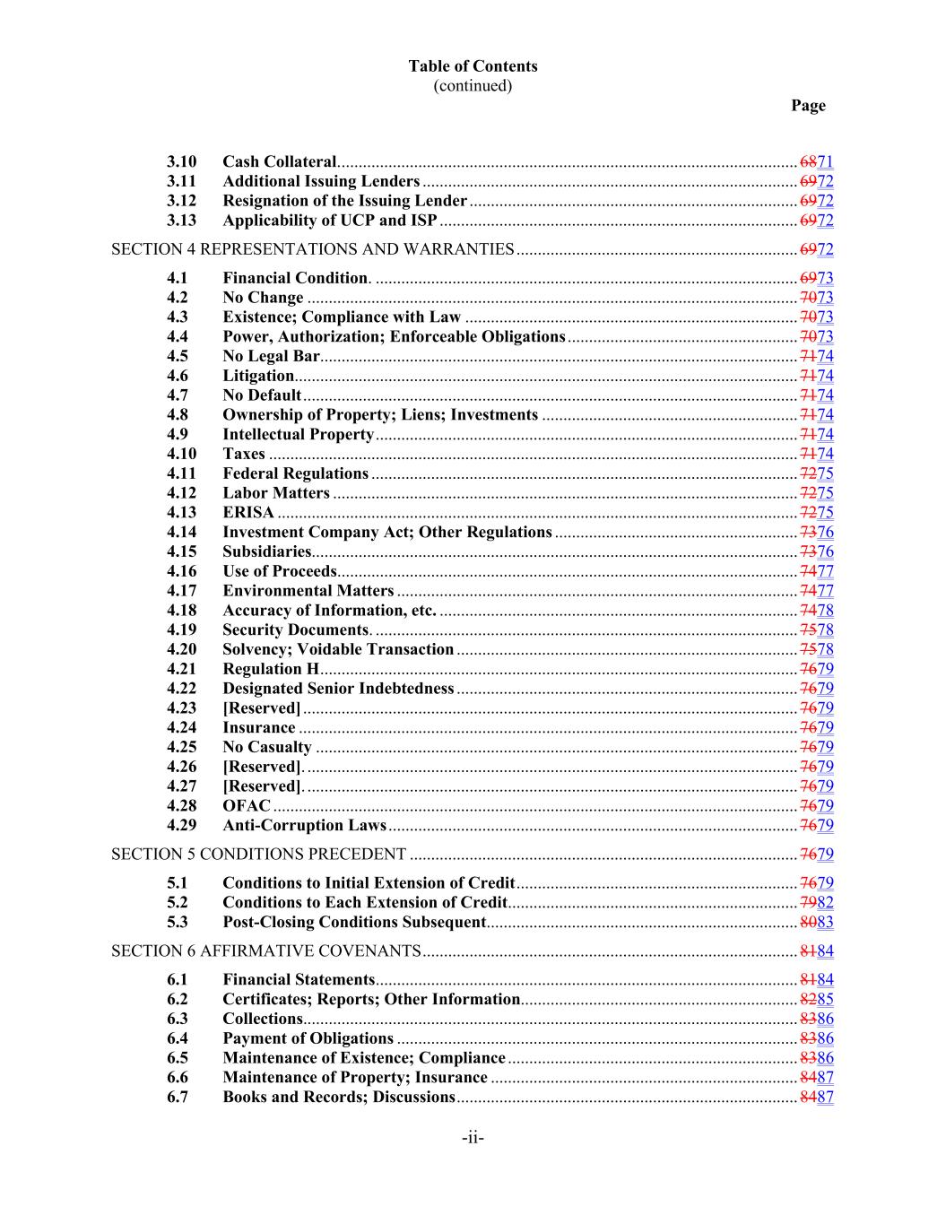 Table of Contents (continued) Page -ii- 3.10 Cash Collateral. ........................................................................................................... 6871 3.11 Additional Issuing Lenders ........................................................................................ 6972 3.12 Resignation of the Issuing Lender ............................................................................. 6972 3.13 Applicability of UCP and ISP .................................................................................... 6972 SECTION 4 REPRESENTATIONS AND WARRANTIES .................................................................. 6972 4.1 Financial Condition. ................................................................................................... 6973 4.2 No Change ................................................................................................................... 7073 4.3 Existence; Compliance with Law .............................................................................. 7073 4.4 Power, Authorization; Enforceable Obligations ...................................................... 7073 4.5 No Legal Bar................................................................................................................ 7174 4.6 Litigation...................................................................................................................... 7174 4.7 No Default .................................................................................................................... 7174 4.8 Ownership of Property; Liens; Investments ............................................................ 7174 4.9 Intellectual Property ................................................................................................... 7174 4.10 Taxes ............................................................................................................................ 7174 4.11 Federal Regulations .................................................................................................... 7275 4.12 Labor Matters ............................................................................................................. 7275 4.13 ERISA .......................................................................................................................... 7275 4.14 Investment Company Act; Other Regulations ......................................................... 7376 4.15 Subsidiaries.................................................................................................................. 7376 4.16 Use of Proceeds ............................................................................................................ 7477 4.17 Environmental Matters .............................................................................................. 7477 4.18 Accuracy of Information, etc. .................................................................................... 7478 4.19 Security Documents. ................................................................................................... 7578 4.20 Solvency; Voidable Transaction ................................................................................ 7578 4.21 Regulation H ................................................................................................................ 7679 4.22 Designated Senior Indebtedness ................................................................................ 7679 4.23 [Reserved] .................................................................................................................... 7679 4.24 Insurance ..................................................................................................................... 7679 4.25 No Casualty ................................................................................................................. 7679 4.26 [Reserved]. ................................................................................................................... 7679 4.27 [Reserved]. ................................................................................................................... 7679 4.28 OFAC ........................................................................................................................... 7679 4.29 Anti-Corruption Laws ................................................................................................ 7679 SECTION 5 CONDITIONS PRECEDENT ........................................................................................... 7679 5.1 Conditions to Initial Extension of Credit .................................................................. 7679 5.2 Conditions to Each Extension of Credit .................................................................... 7982 5.3 Post-Closing Conditions Subsequent......................................................................... 8083 SECTION 6 AFFIRMATIVE COVENANTS ........................................................................................ 8184 6.1 Financial Statements ................................................................................................... 8184 6.2 Certificates; Reports; Other Information................................................................. 8285 6.3 Collections.................................................................................................................... 8386 6.4 Payment of Obligations .............................................................................................. 8386 6.5 Maintenance of Existence; Compliance .................................................................... 8386 6.6 Maintenance of Property; Insurance ........................................................................ 8487 6.7 Books and Records; Discussions ................................................................................ 8487