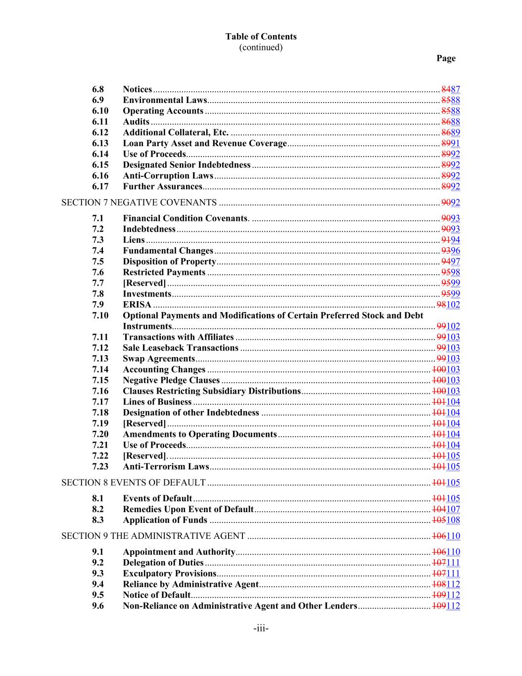 Table of Contents (continued) Page -iii- 6.8 Notices .......................................................................................................................... 8487 6.9 Environmental Laws. .................................................................................................. 8588 6.10 Operating Accounts .................................................................................................... 8588 6.11 Audits ........................................................................................................................... 8688 6.12 Additional Collateral, Etc. ......................................................................................... 8689 6.13 Loan Party Asset and Revenue Coverage ................................................................. 8991 6.14 Use of Proceeds ............................................................................................................ 8992 6.15 Designated Senior Indebtedness ................................................................................ 8992 6.16 Anti-Corruption Laws ................................................................................................ 8992 6.17 Further Assurances ..................................................................................................... 8992 SECTION 7 NEGATIVE COVENANTS .............................................................................................. 9092 7.1 Financial Condition Covenants. ................................................................................ 9093 7.2 Indebtedness ................................................................................................................ 9093 7.3 Liens ............................................................................................................................. 9194 7.4 Fundamental Changes ................................................................................................ 9396 7.5 Disposition of Property ............................................................................................... 9497 7.6 Restricted Payments ................................................................................................... 9598 7.7 [Reserved] .................................................................................................................... 9599 7.8 Investments .................................................................................................................. 9599 7.9 ERISA ........................................................................................................................ 98102 7.10 Optional Payments and Modifications of Certain Preferred Stock and Debt Instruments................................................................................................................ 99102 7.11 Transactions with Affiliates ..................................................................................... 99103 7.12 Sale Leaseback Transactions ................................................................................... 99103 7.13 Swap Agreements ...................................................................................................... 99103 7.14 Accounting Changes ............................................................................................... 100103 7.15 Negative Pledge Clauses ......................................................................................... 100103 7.16 Clauses Restricting Subsidiary Distributions ....................................................... 100103 7.17 Lines of Business ..................................................................................................... 101104 7.18 Designation of other Indebtedness ........................................................................ 101104 7.19 [Reserved] ................................................................................................................ 101104 7.20 Amendments to Operating Documents ................................................................. 101104 7.21 Use of Proceeds ........................................................................................................ 101104 7.22 [Reserved]. ............................................................................................................... 101105 7.23 Anti-Terrorism Laws .............................................................................................. 101105 SECTION 8 EVENTS OF DEFAULT ............................................................................................... 101105 8.1 Events of Default ..................................................................................................... 101105 8.2 Remedies Upon Event of Default ........................................................................... 104107 8.3 Application of Funds .............................................................................................. 105108 SECTION 9 THE ADMINISTRATIVE AGENT .............................................................................. 106110 9.1 Appointment and Authority................................................................................... 106110 9.2 Delegation of Duties ................................................................................................ 107111 9.3 Exculpatory Provisions ........................................................................................... 107111 9.4 Reliance by Administrative Agent ......................................................................... 108112 9.5 Notice of Default ...................................................................................................... 109112 9.6 Non-Reliance on Administrative Agent and Other Lenders ............................... 109112