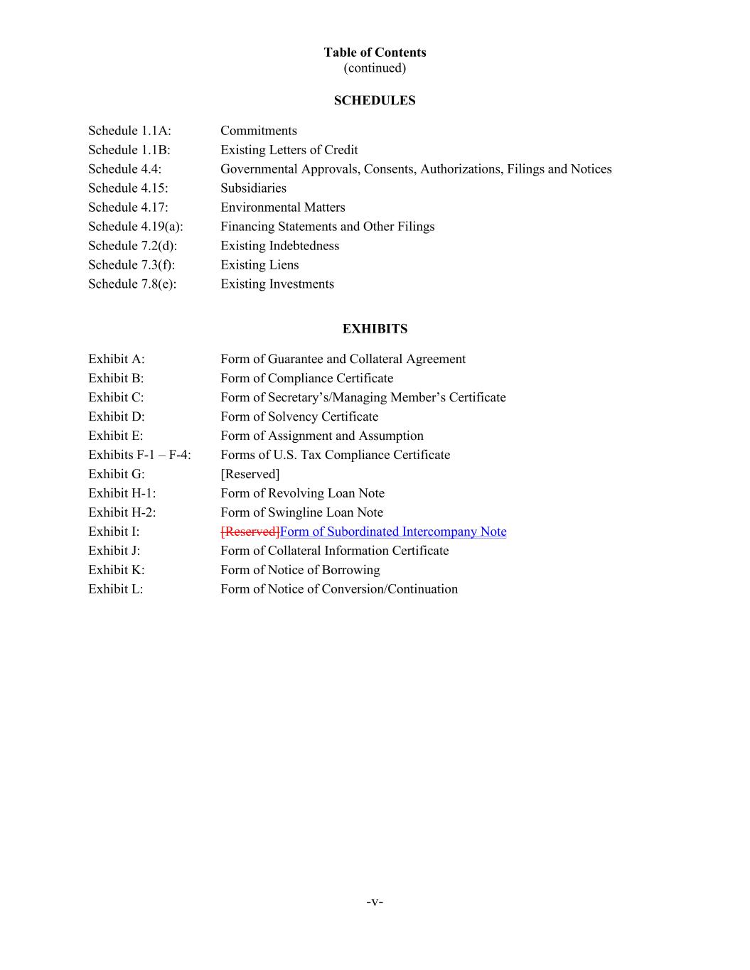 Table of Contents (continued) -v- SCHEDULES Schedule 1.1A: Commitments Schedule 1.1B: Existing Letters of Credit Schedule 4.4: Governmental Approvals, Consents, Authorizations, Filings and Notices Schedule 4.15: Subsidiaries Schedule 4.17: Environmental Matters Schedule 4.19(a): Financing Statements and Other Filings Schedule 7.2(d): Existing Indebtedness Schedule 7.3(f): Existing Liens Schedule 7.8(e): Existing Investments EXHIBITS Exhibit A: Form of Guarantee and Collateral Agreement Exhibit B: Form of Compliance Certificate Exhibit C: Form of Secretary’s/Managing Member’s Certificate Exhibit D: Form of Solvency Certificate Exhibit E: Form of Assignment and Assumption Exhibits F-1 – F-4: Forms of U.S. Tax Compliance Certificate Exhibit G: [Reserved] Exhibit H-1: Form of Revolving Loan Note Exhibit H-2: Form of Swingline Loan Note Exhibit I: [Reserved]Form of Subordinated Intercompany Note Exhibit J: Form of Collateral Information Certificate Exhibit K: Form of Notice of Borrowing Exhibit L: Form of Notice of Conversion/Continuation